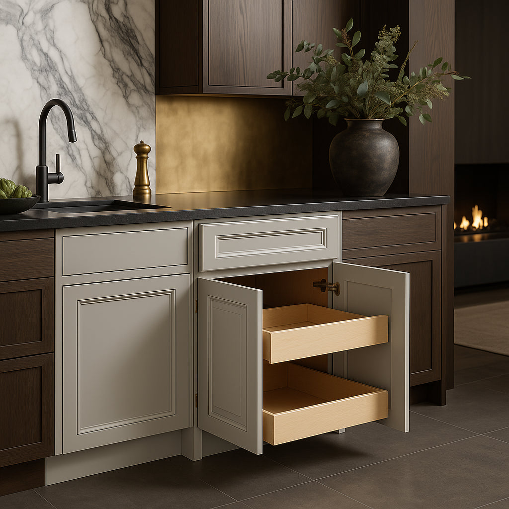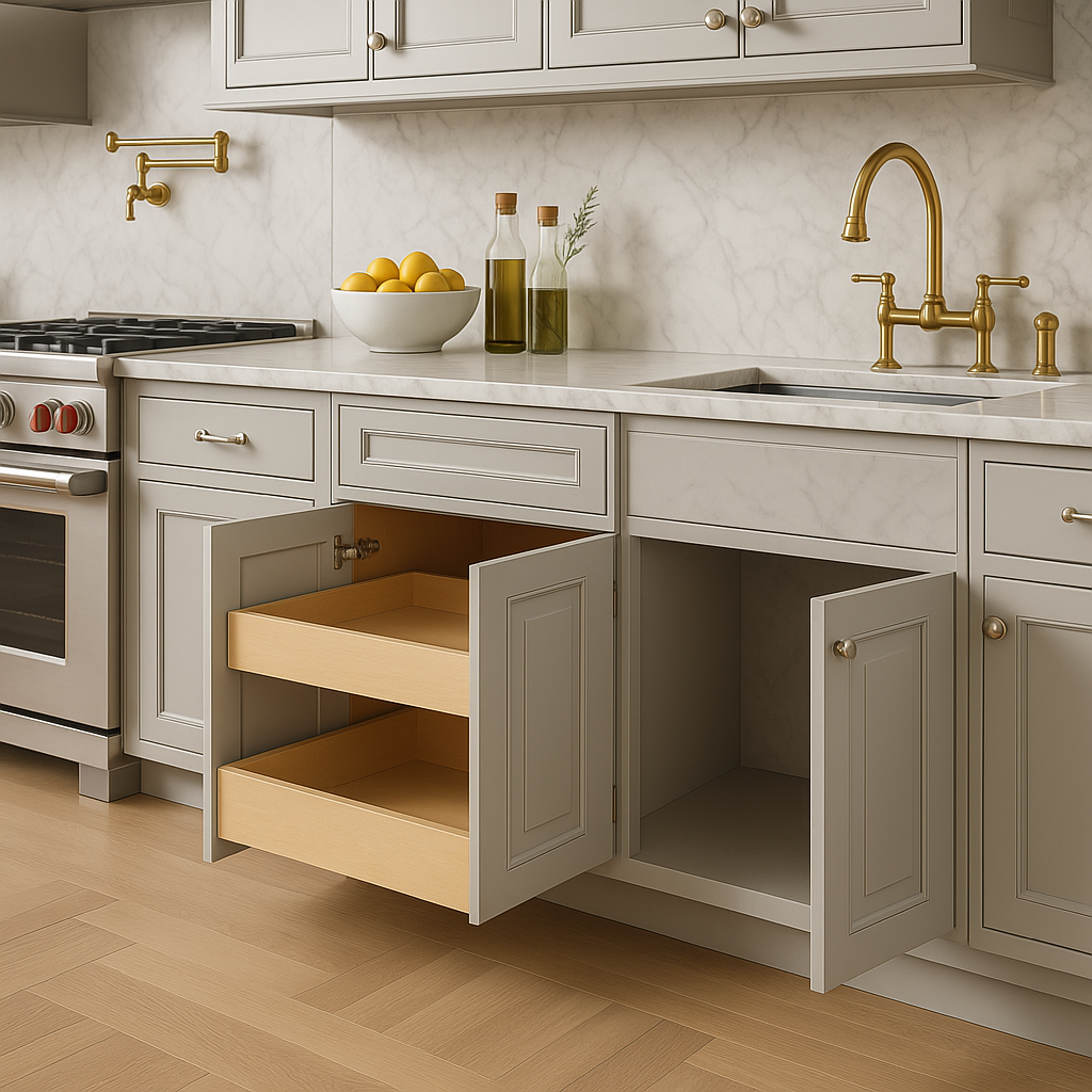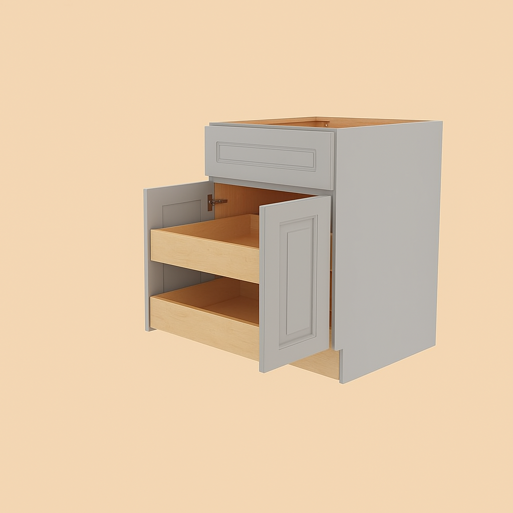 The Grayson Pearl Gray cabinet combines elegant shaker design with durable all-plywood construction. Featuring soft-close doors and drawers, it offers both style and functionality for a modern kitchen.