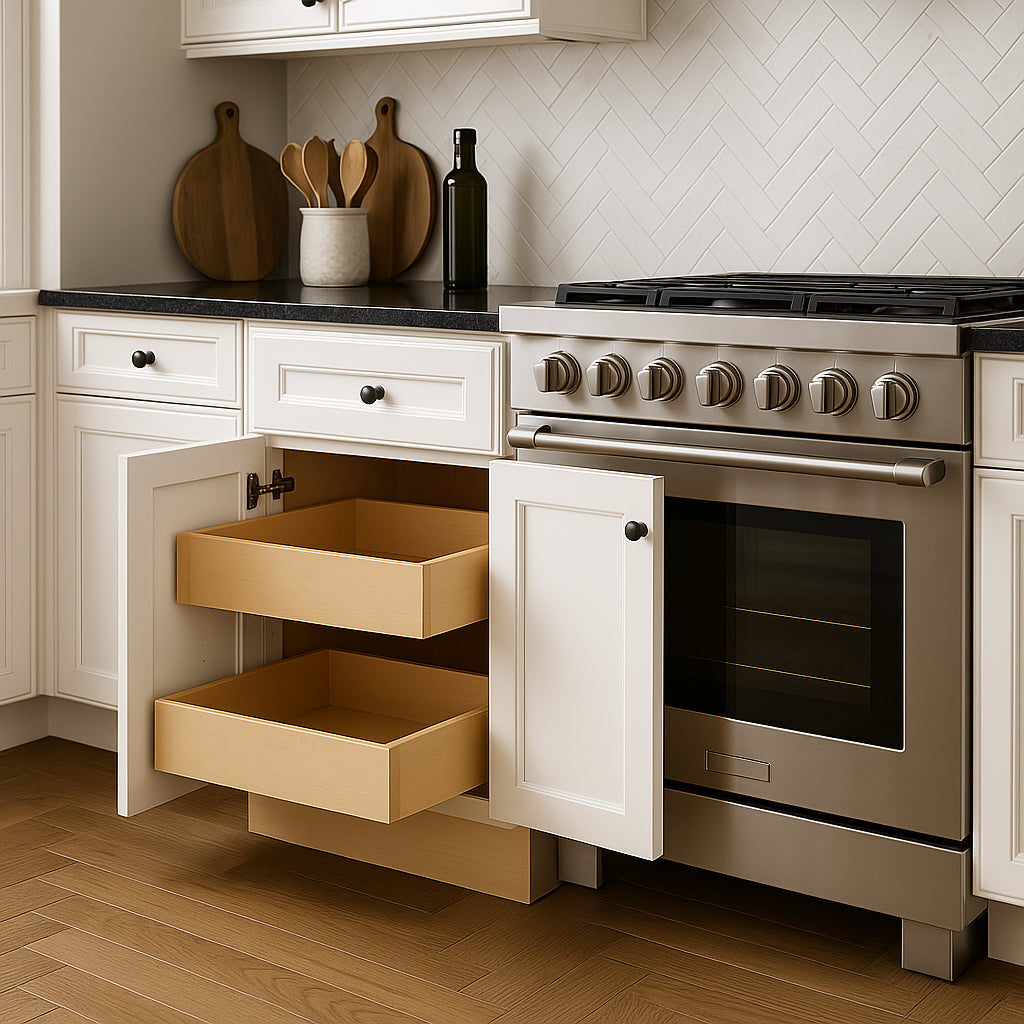 • Practical Storage: Equipped with two roll-out spice trays and adjustable shelves for versatile organization.