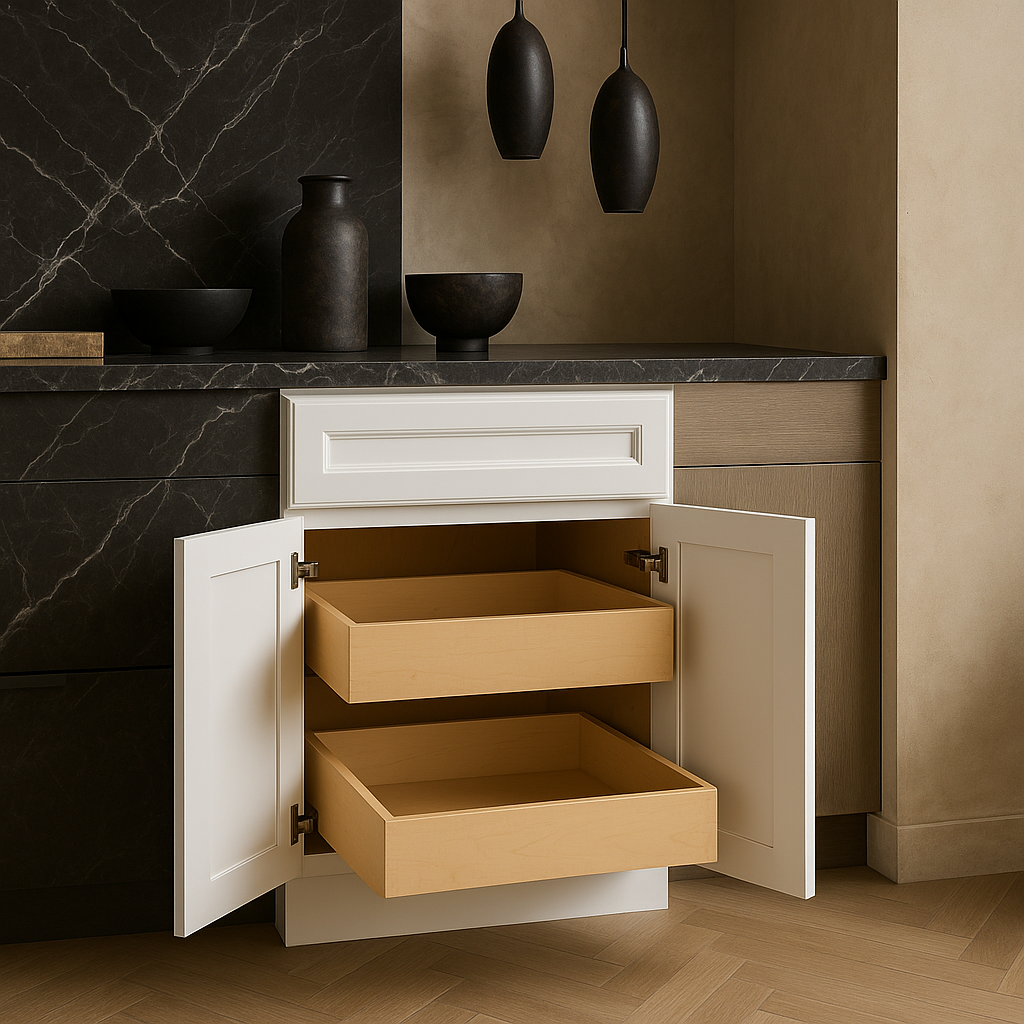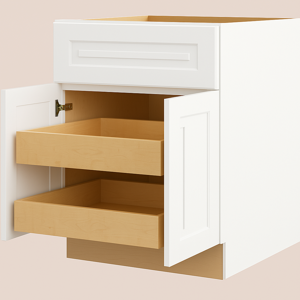 The Grayson Plywood Base Kitchen Cabinet combines durable all-plywood construction with elegant shaker-style panels in Pacific White. Featuring soft close doors and drawers, adjustable shelves, and roll-out spice trays, it offers both style and practicality for a modern kitchen.