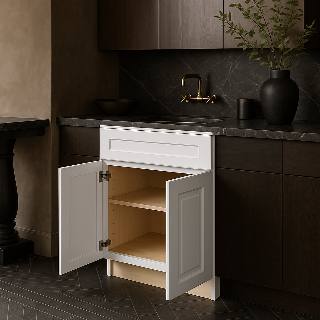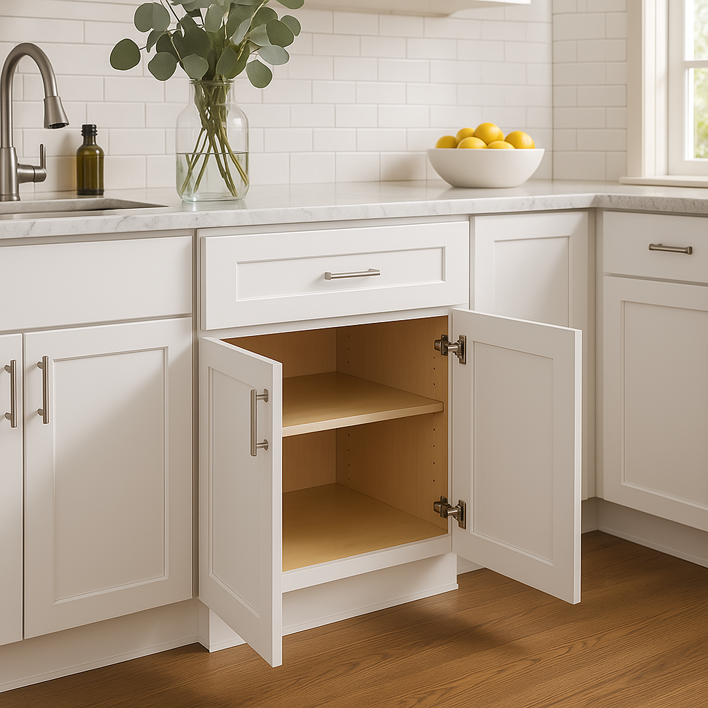 The Grayson Plywood Base Kitchen Cabinet combines durability and elegance with its CARB II compliant plywood construction and Pacific White finish. Featuring soft-close doors and drawers, it offers quiet luxury and adjustable shelving for versatile storage.