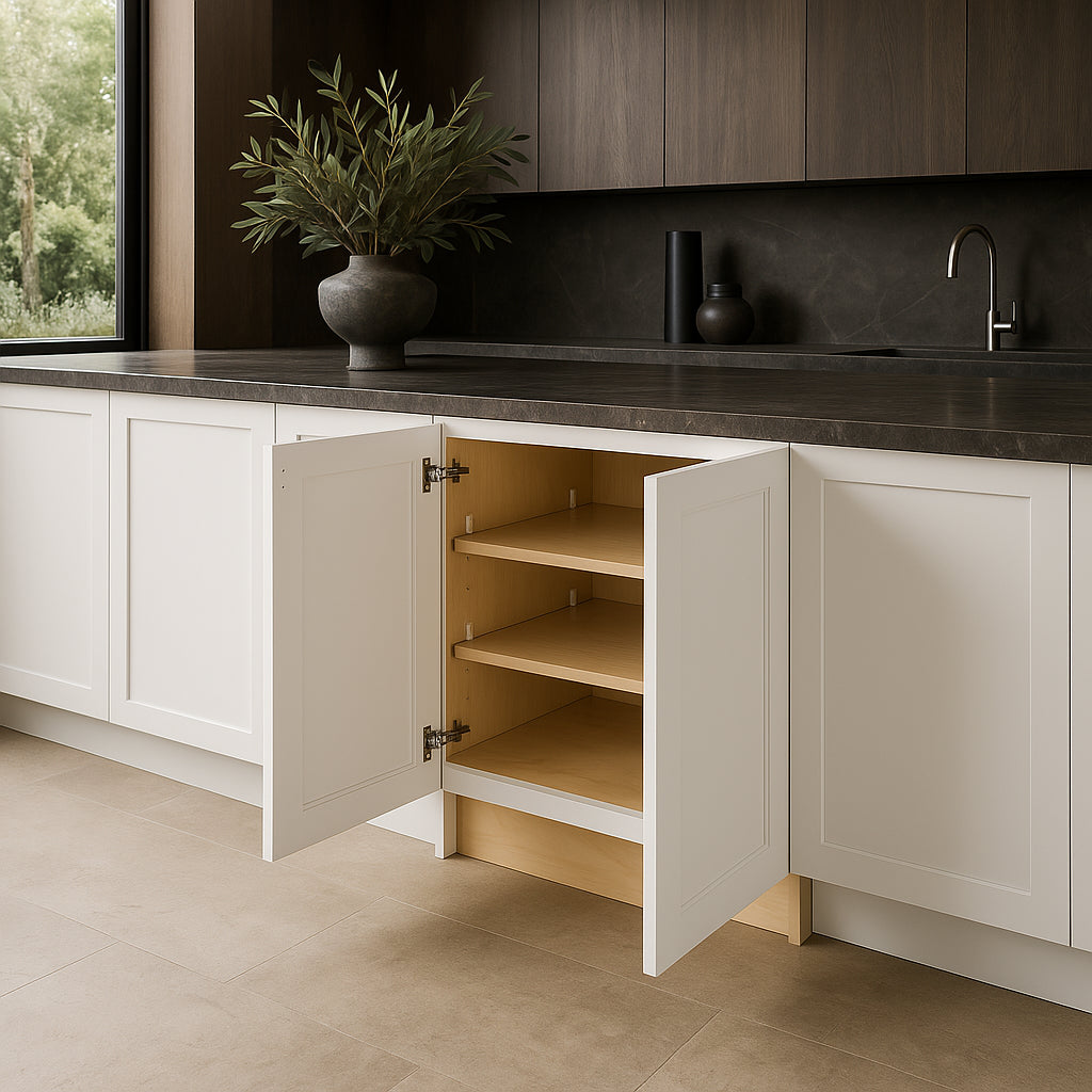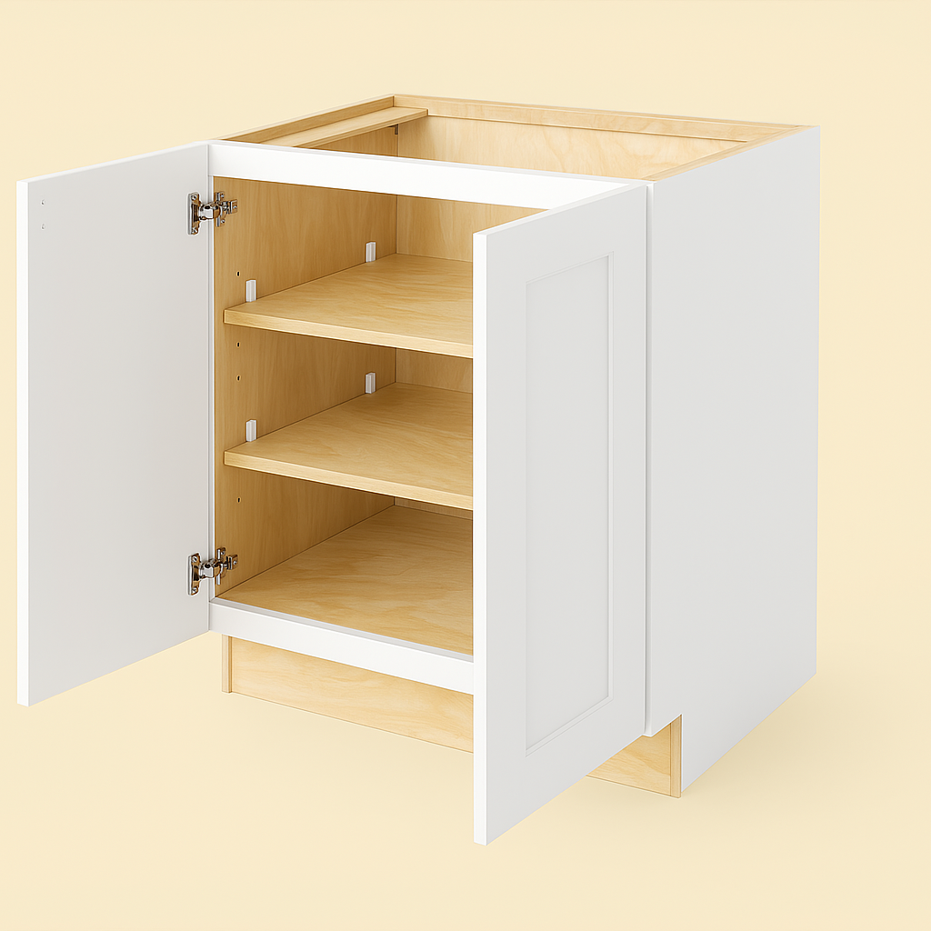 The Grayson Kitchen Cabinet in Pacific White combines elegant shaker style with durable plywood construction. Featuring soft-close doors and full-depth adjustable shelves, it offers both style and functionality for your kitchen.