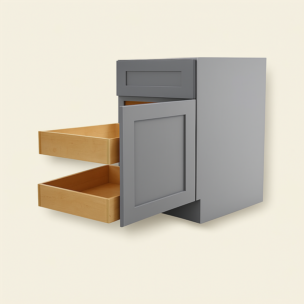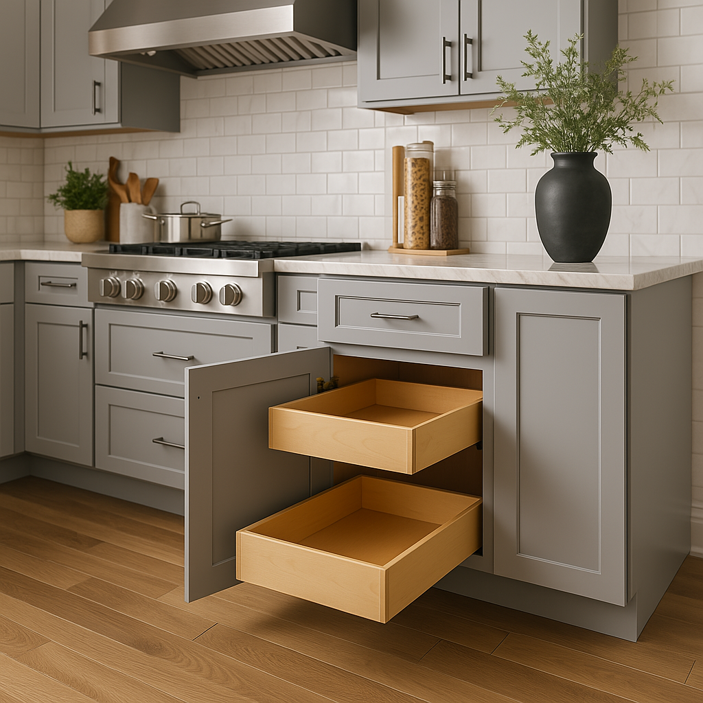 The Newport Pearl Gray Kitchen Cabinet combines durable all-plywood construction with a sleek Shaker-style design. Its soft-close doors and drawers, along with integrated rollout trays, offer both elegance and functionality for modern kitchens.