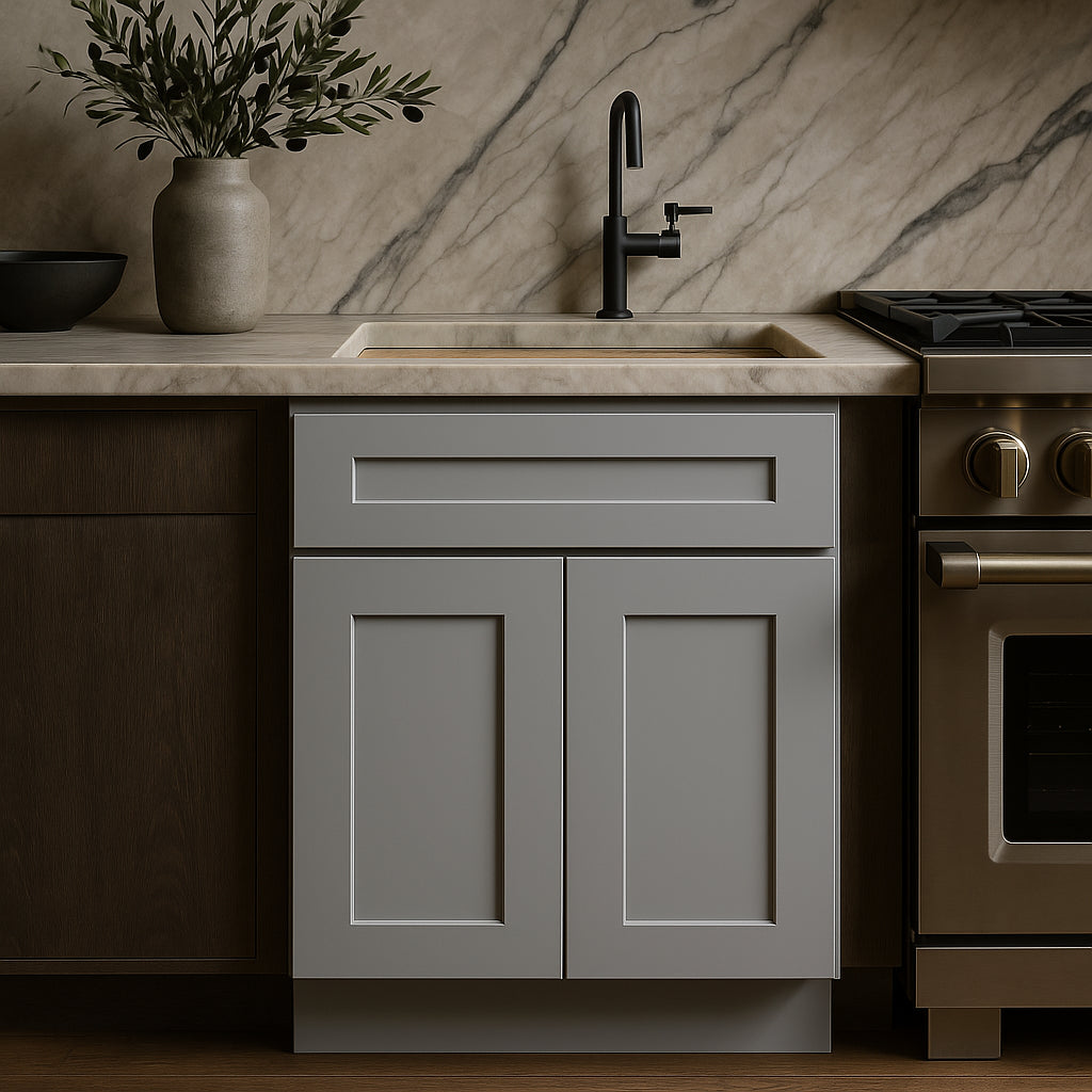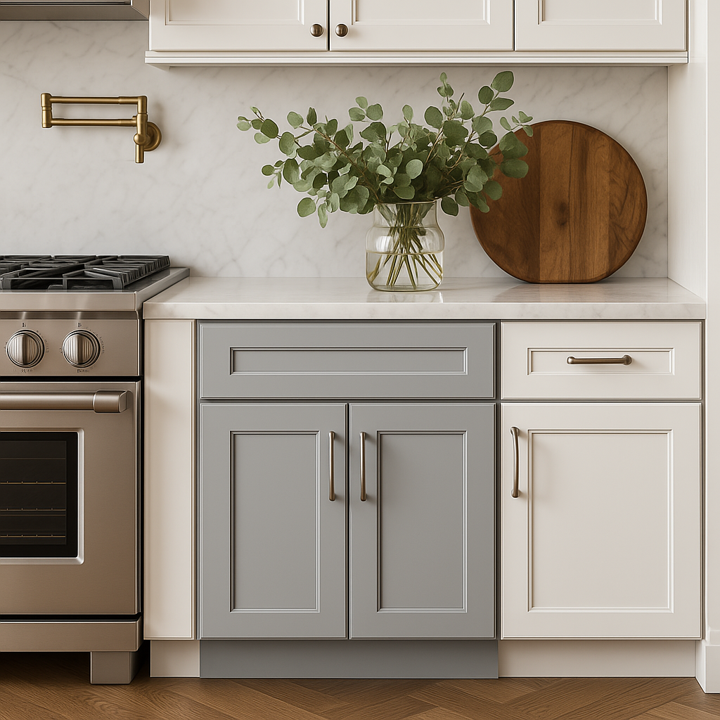 The Newport Pearl Gray Base Kitchen Cabinet combines durable plywood construction with elegant Shaker-style doors and a Pearl Gray finish. Featuring soft-close drawers and rollout trays, it offers both style and functionality for a modern kitchen.