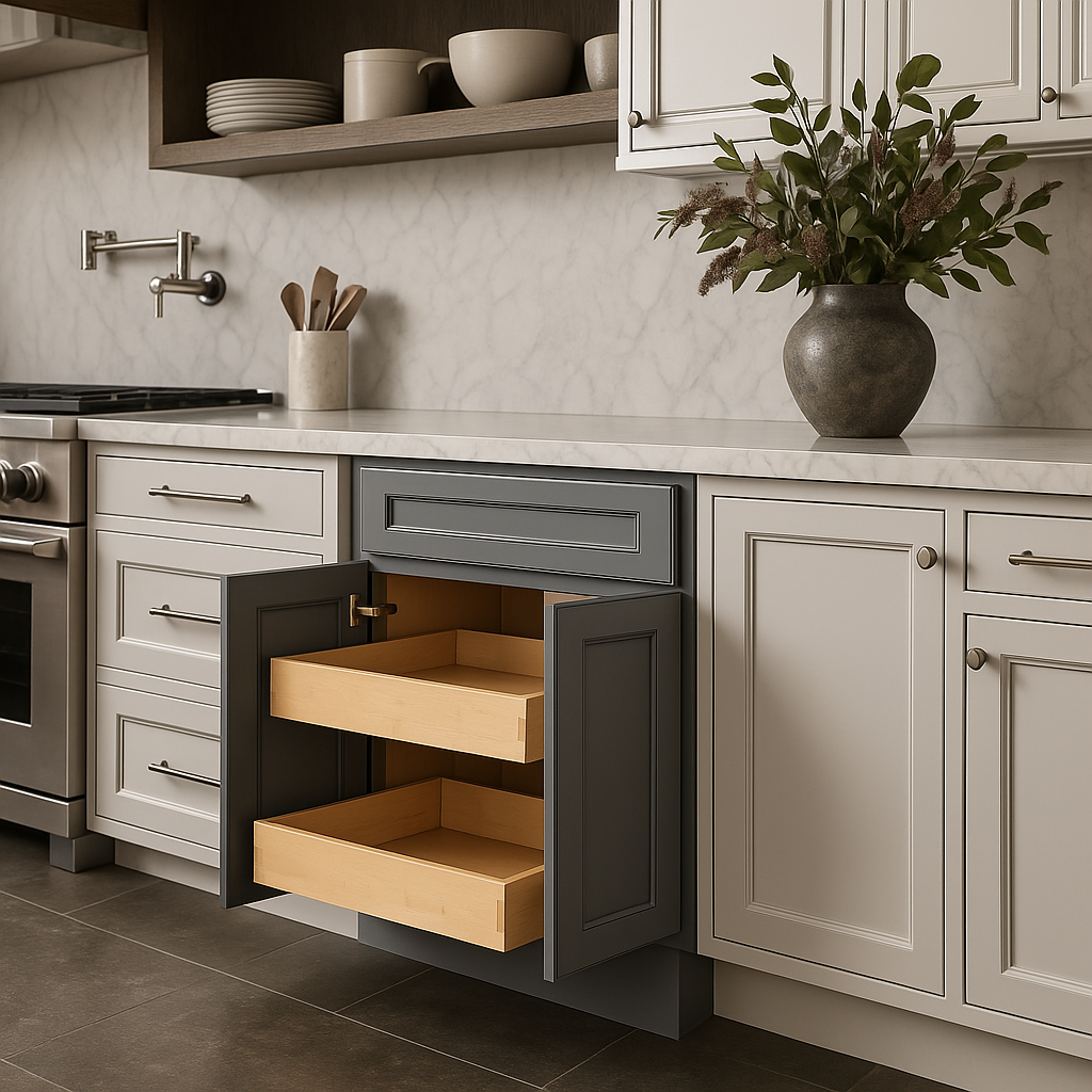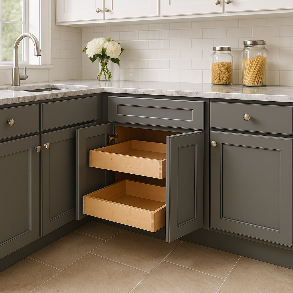 The Newport Pearl Gray Kitchen Cabinet combines elegant design with practical features, including soft-close doors and drawers, rollout spice trays, and durable plywood construction. Its Shaker-style design and pearl gray finish make it a stylish addition to any kitchen.