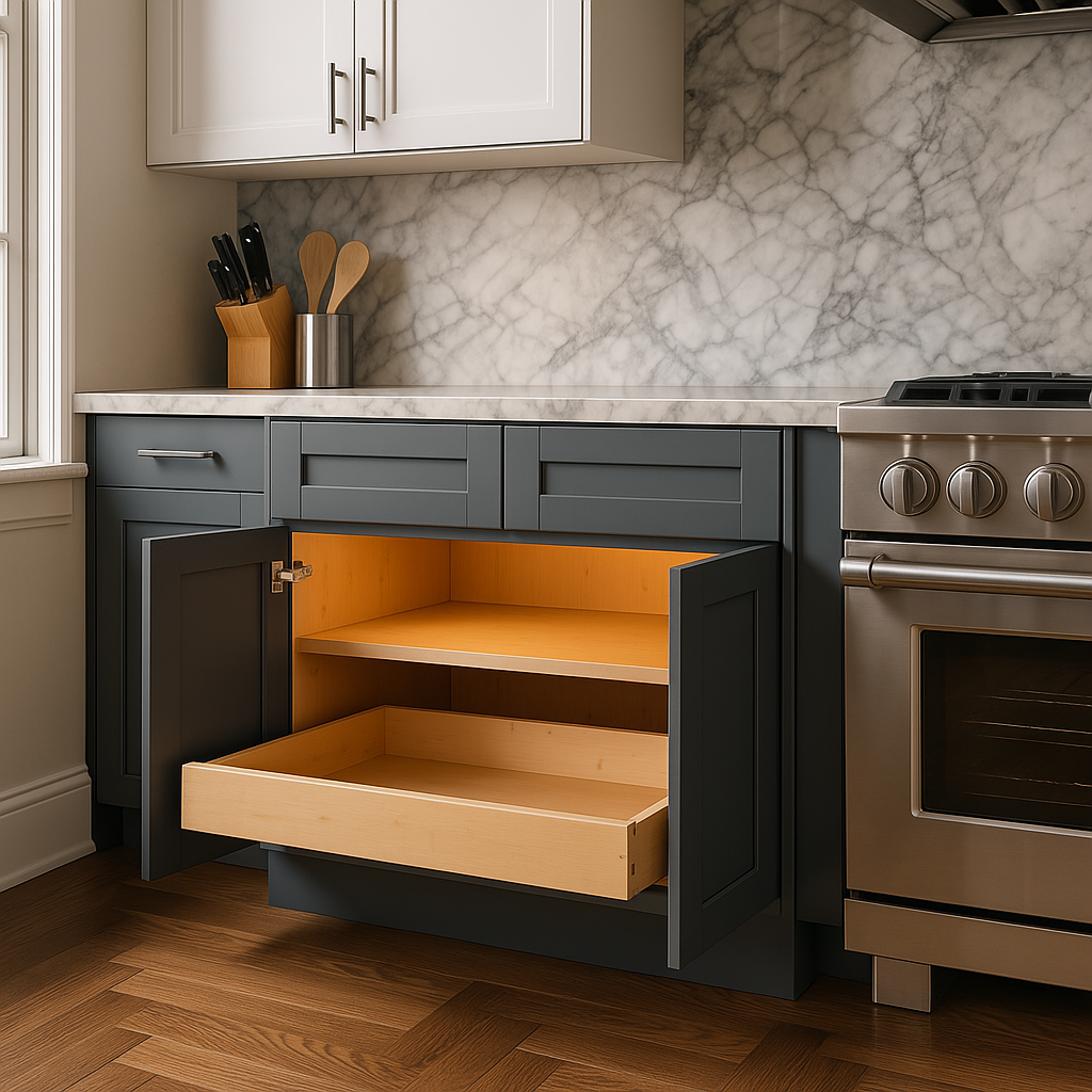| Kitchen Cabinet Features | Finished Interior, Full Depth Shelves, Full Extension Drawers, Modular, Moisture Resistant, Soft Close Doors, Soft Close Drawers, Solid Wood, Structural Toe Kicks Included |