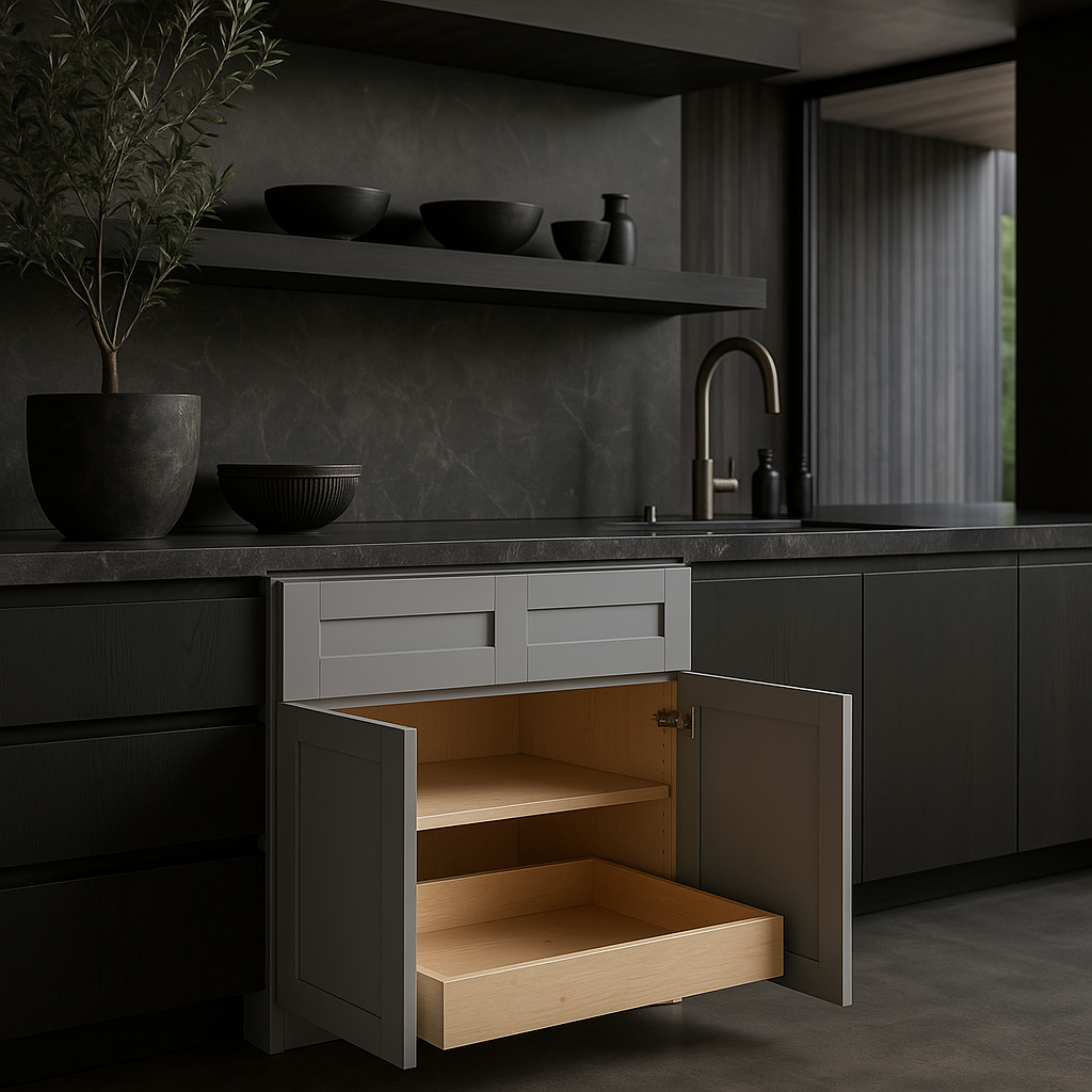 The Veiled Gray Shaker Base Kitchen Cabinet combines modern design with durable construction. Featuring soft-close doors and drawers, adjustable shelves, and a sleek gray finish, it is perfect for enhancing any kitchen space.