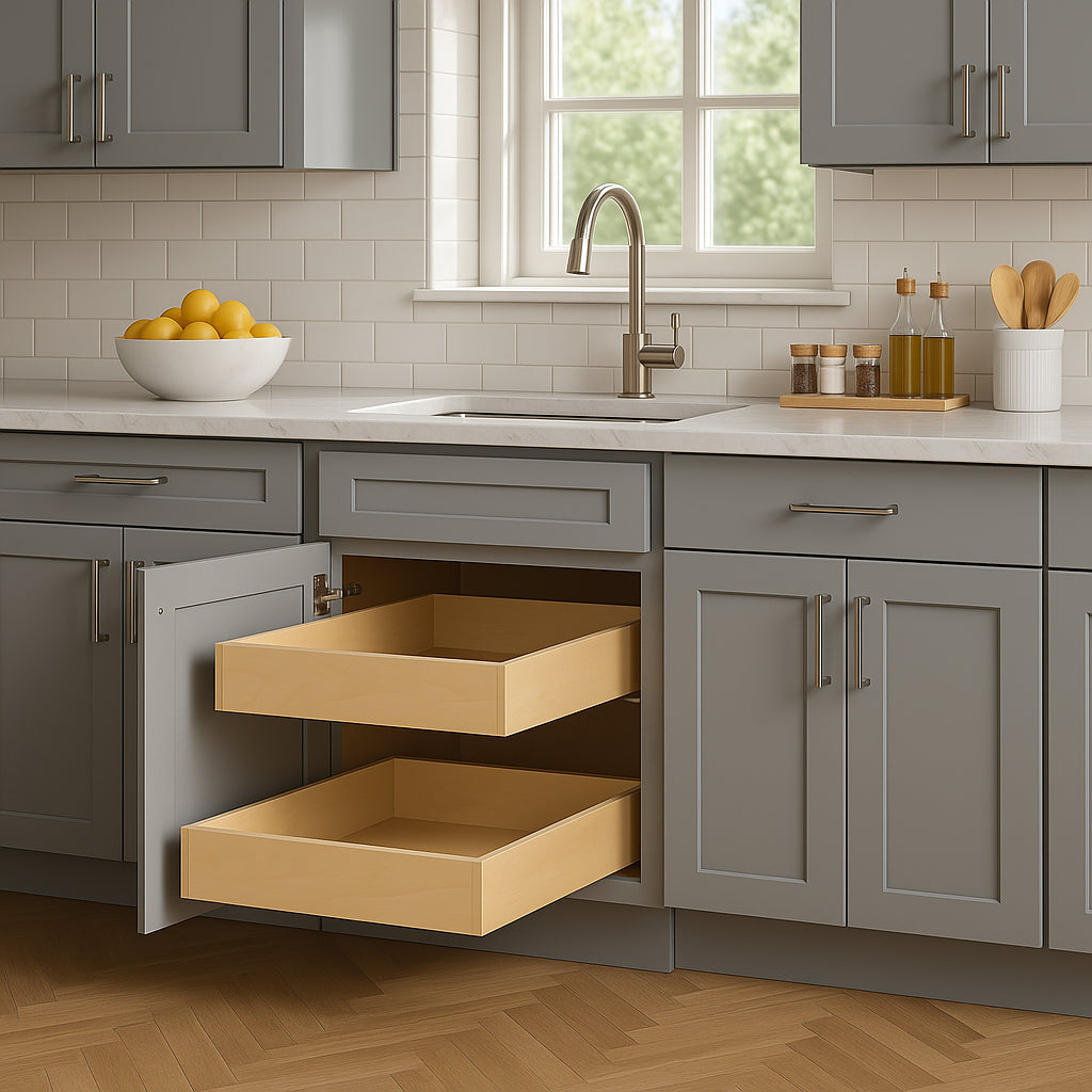 Transform your kitchen with the Veiled Gray Shaker Base Cabinet—order now to experience elegance and durability.