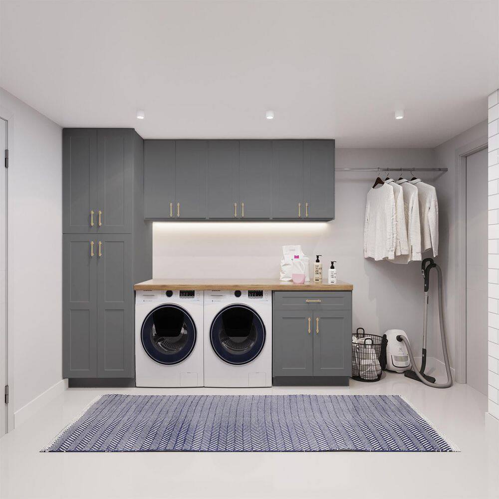 Elevate your kitchen with the HOMEIBRO Newport Gray Shaker Base Cabinet, featuring a modern satin finish and durable birchwood construction. Designed with slow-close functionality, this versatile cabinet keeps rooms quiet and organized while adding a sleek, contemporary touch.