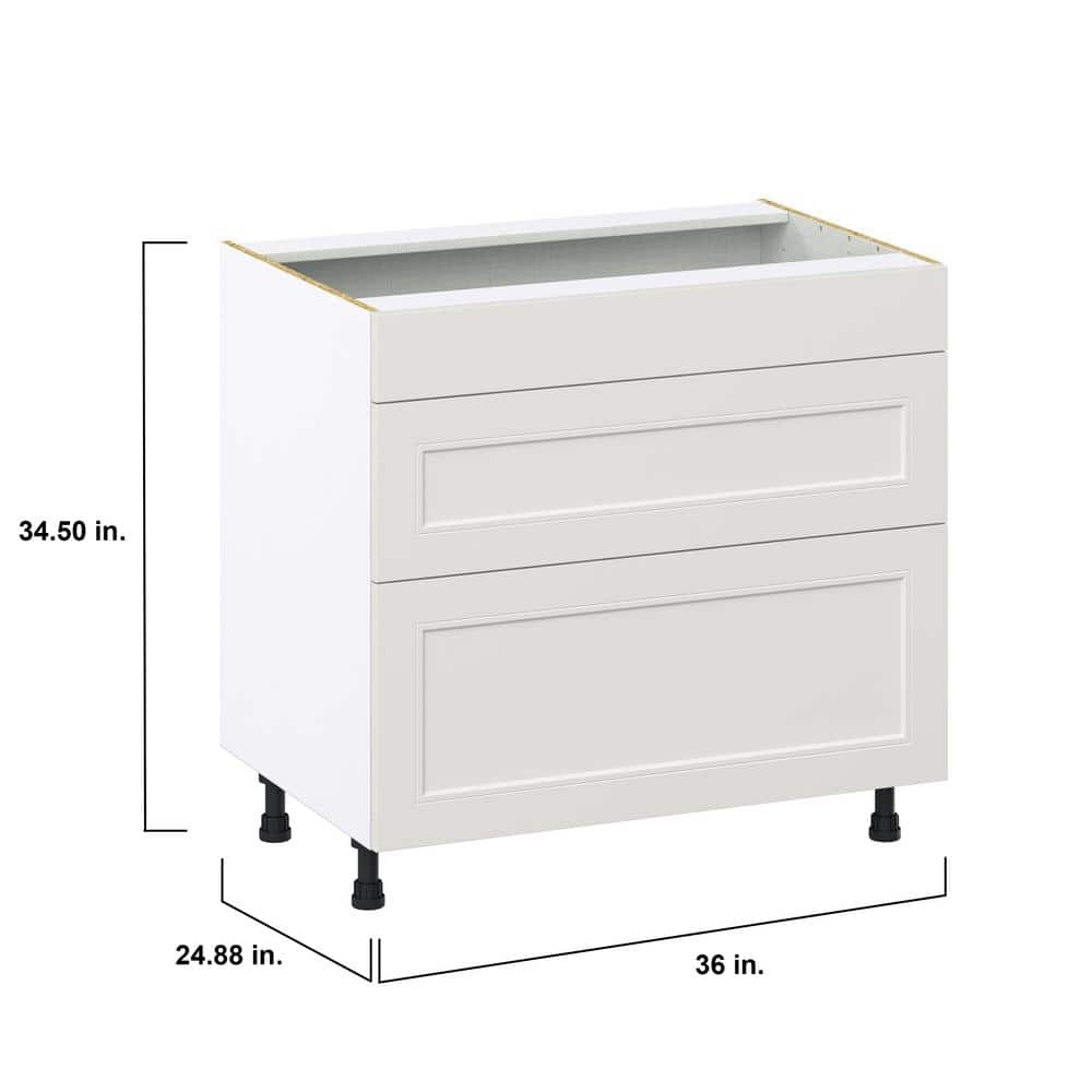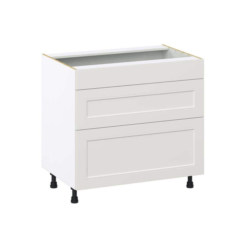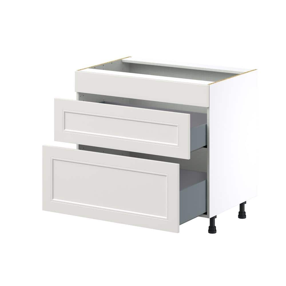The J COLLECTION Littleton Cooktop Base Kitchen Cabinet in painted light gray offers a sleek, modern solution for your kitchen layout. With its frameless design and soft-close drawers, it provides both style and functionality, making your kitchen an efficient and inviting space for cooking and entertaining.