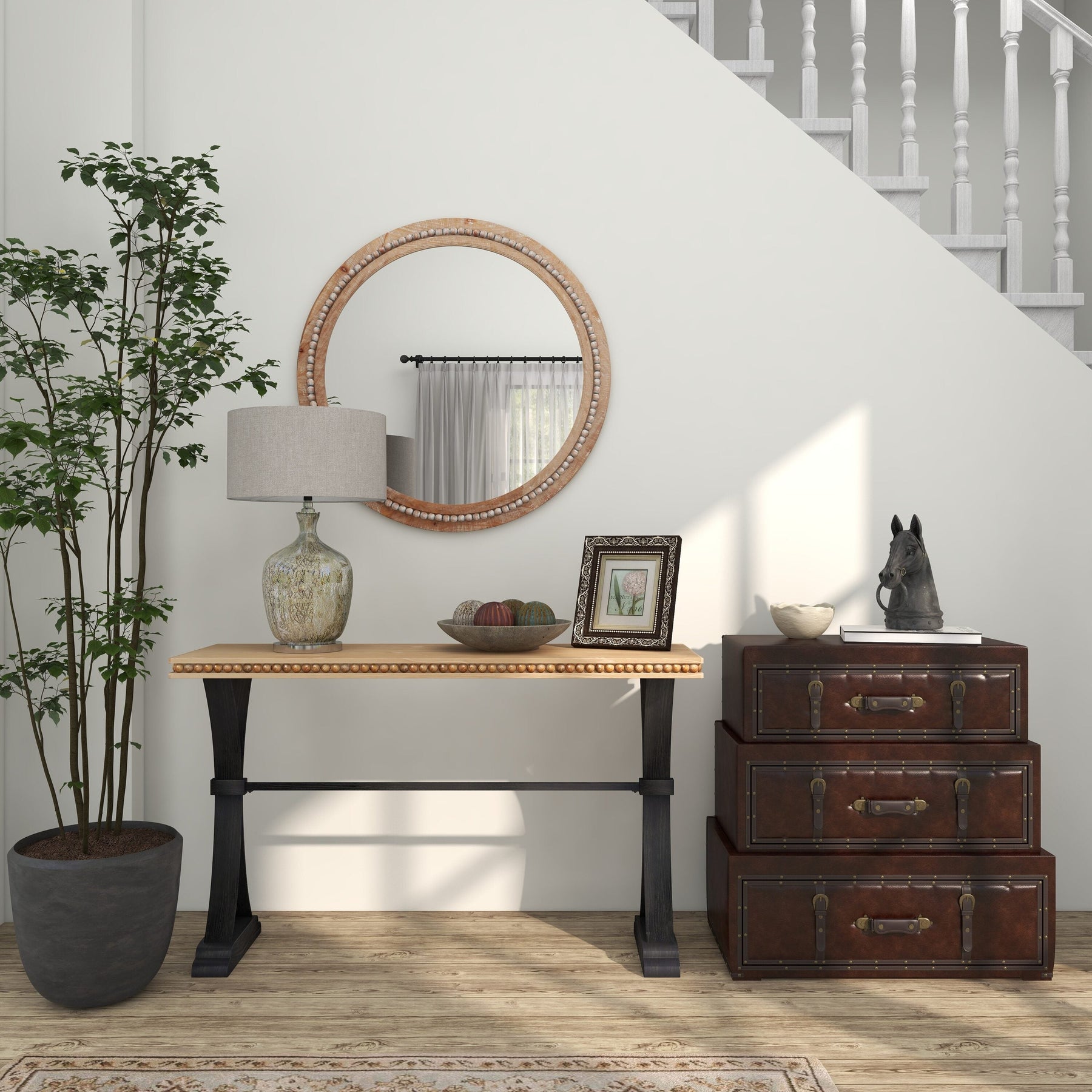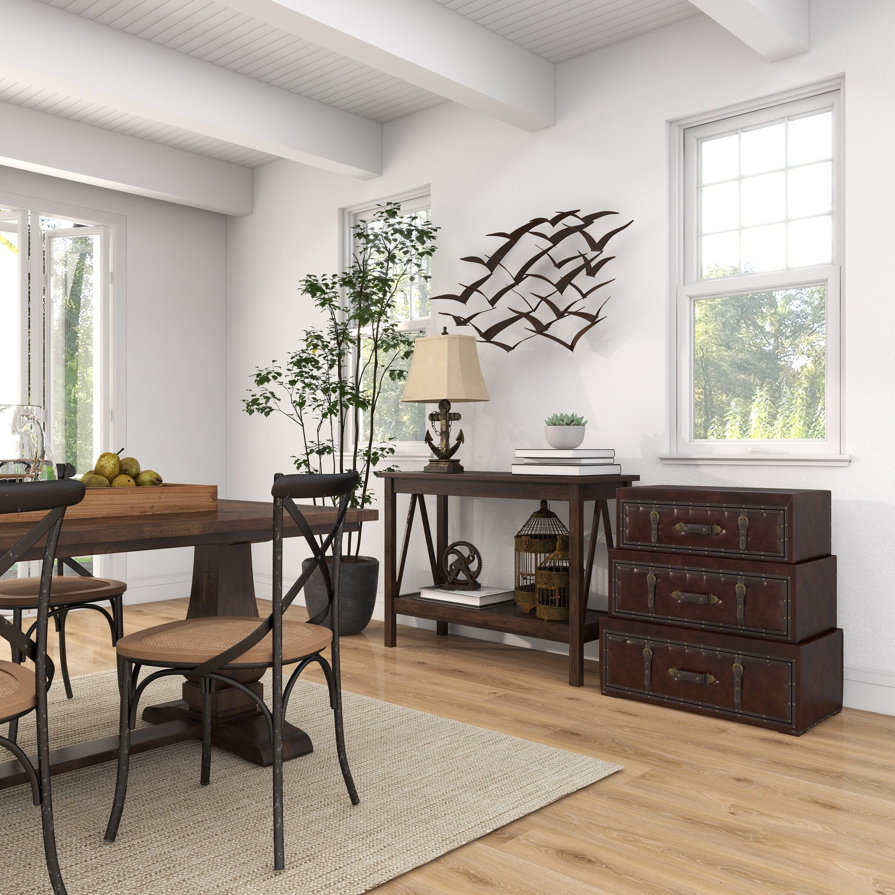 • Storage: Three varying size drawers with buckle straps, bolted handles, and rivet detailing for authentic old-world style.