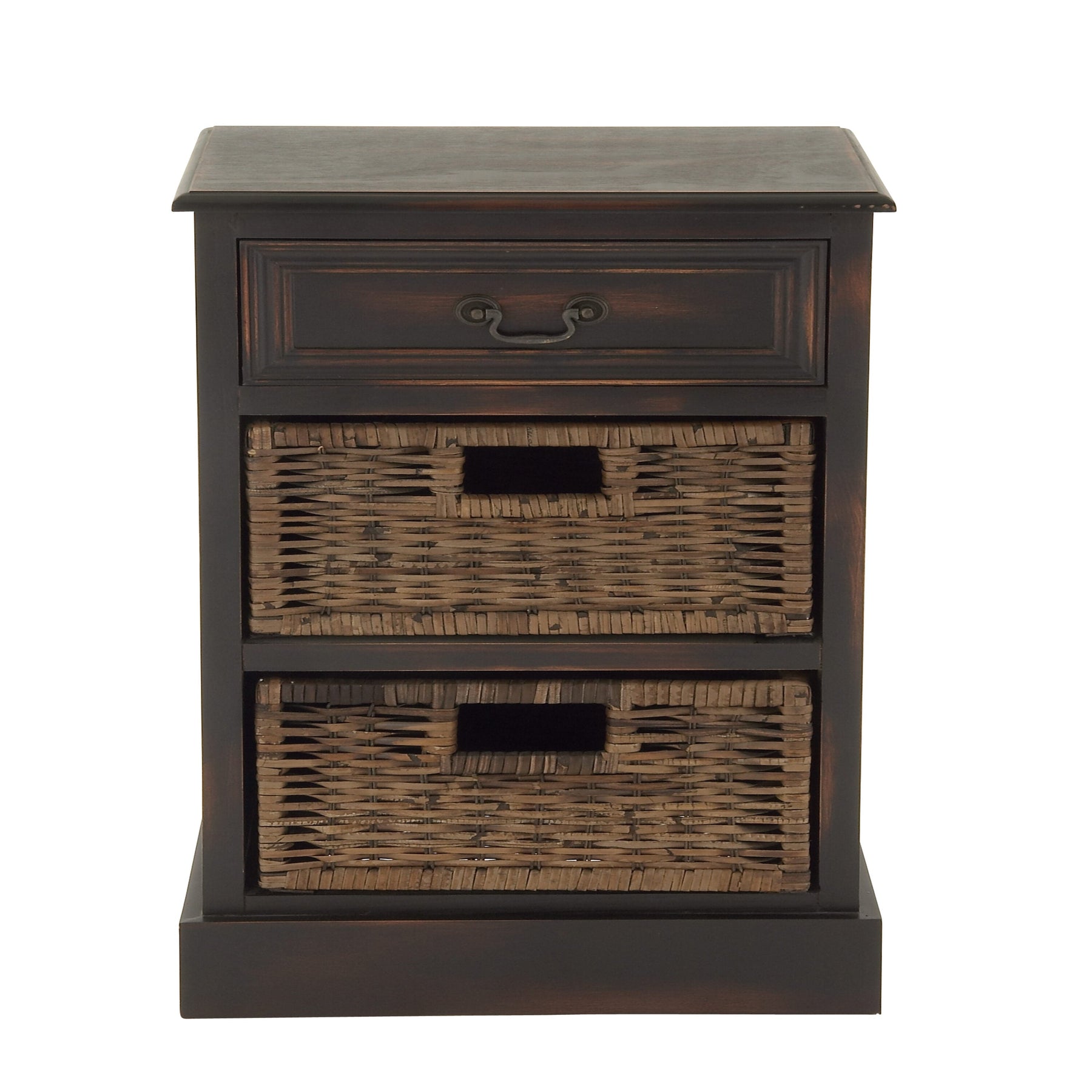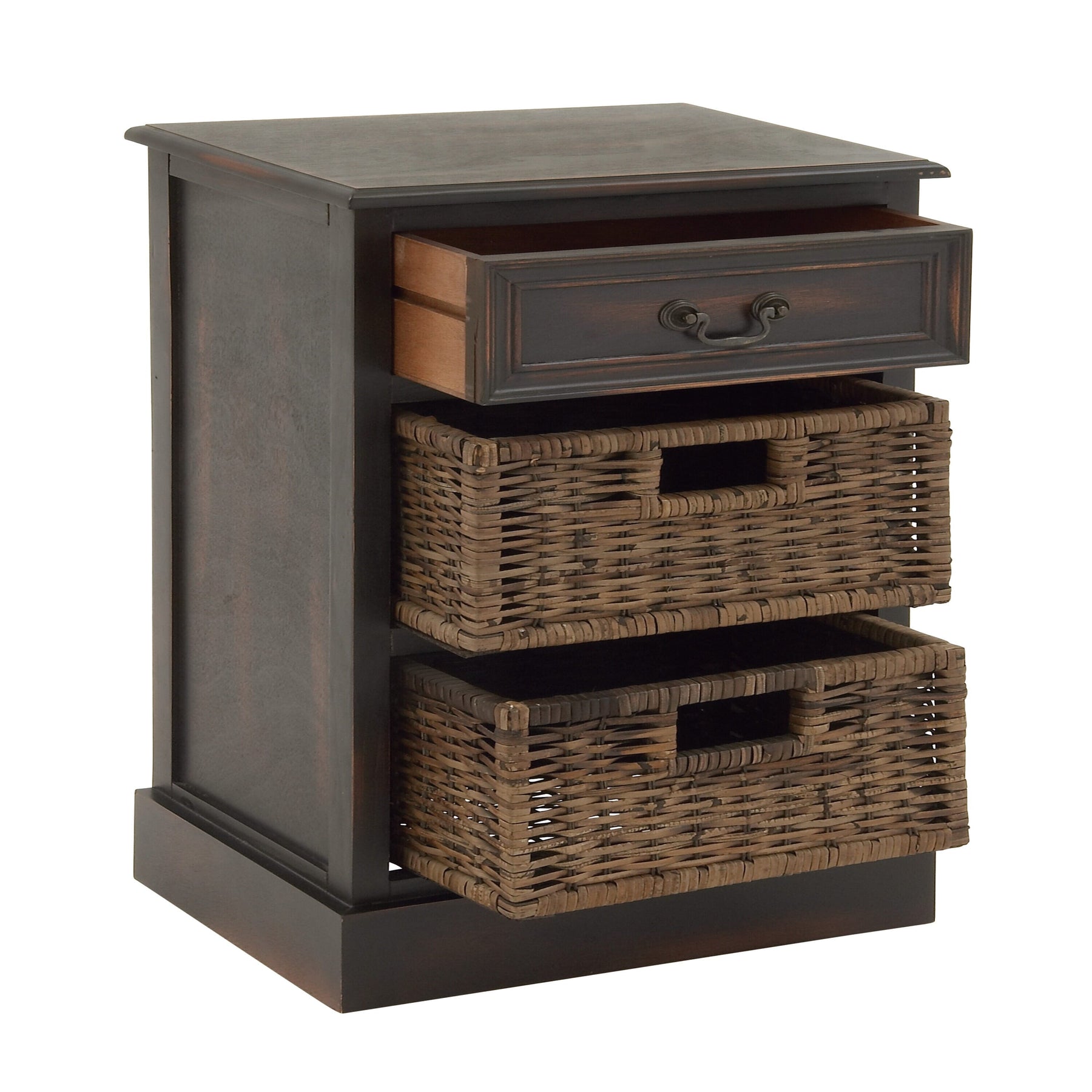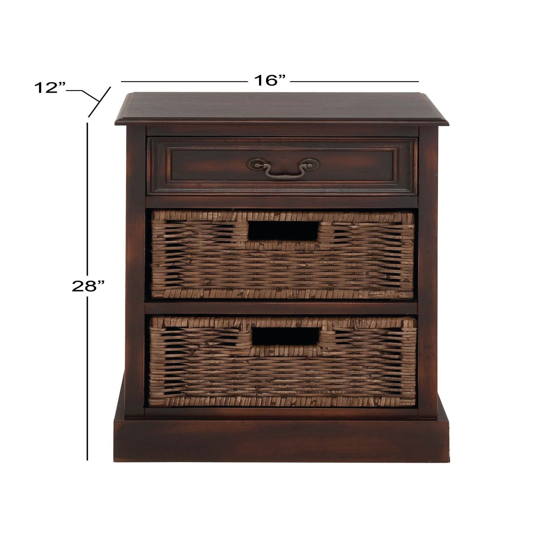 Elevate your space with the Grayson Lane Dark Brown Matte Fir 1-Drawer Accent Chest, featuring classic design elements fit for a traditional home setting. Crafted from red pine wood, this elegantly finished piece offers both style and storage with a single pull-out drawer and two wicker baskets. Its compact yet functional structure makes it the perfect accent for any room.