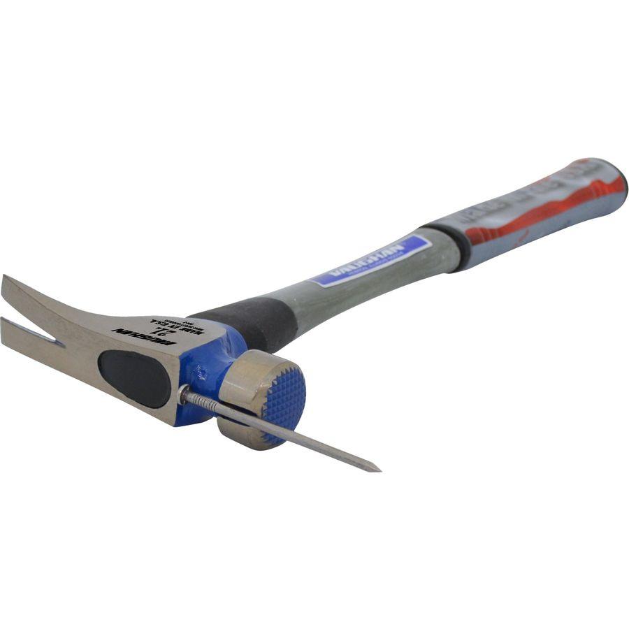 21-oz California framer, milled face, fiberglass handle, straight claw Magnetic nail starter Hollow core fiberglass handle to absorb shock Made in USA 21 oz