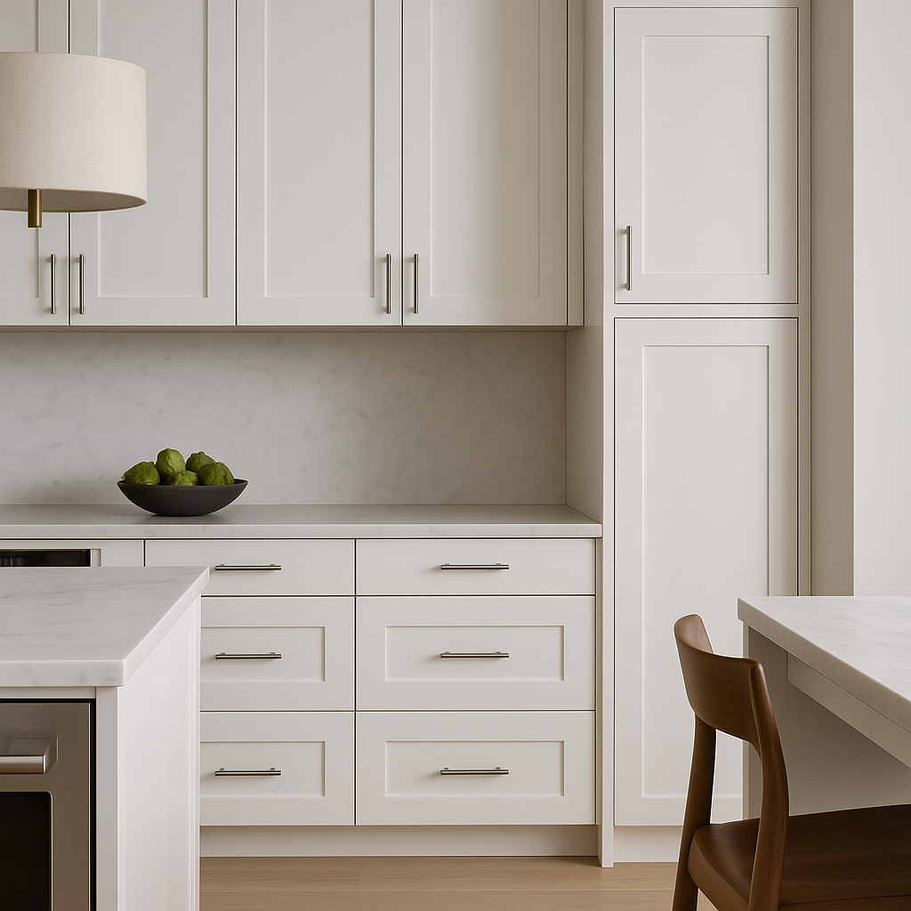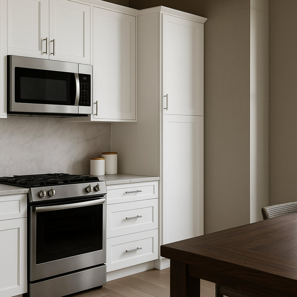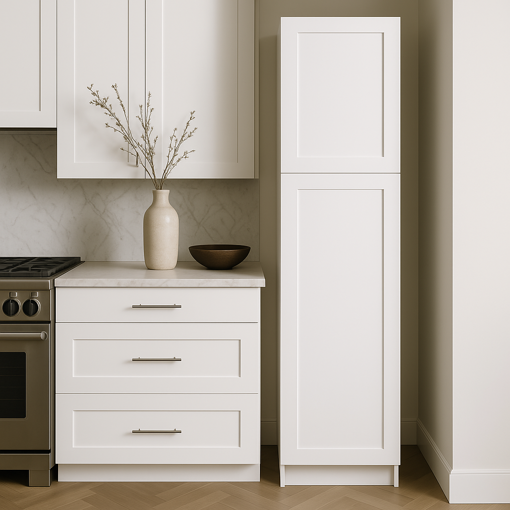 The Hampton Bay Avondale Pantry Cabinet offers a sleek shaker style with durable plywood construction and a premium Alpine White finish. Featuring soft-close doors and adjustable shelves, it ensures both functionality and elegance for your kitchen.
