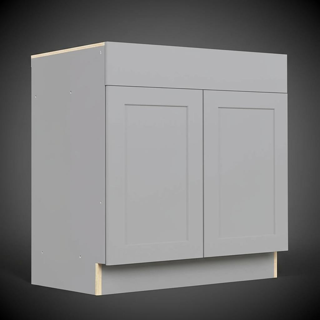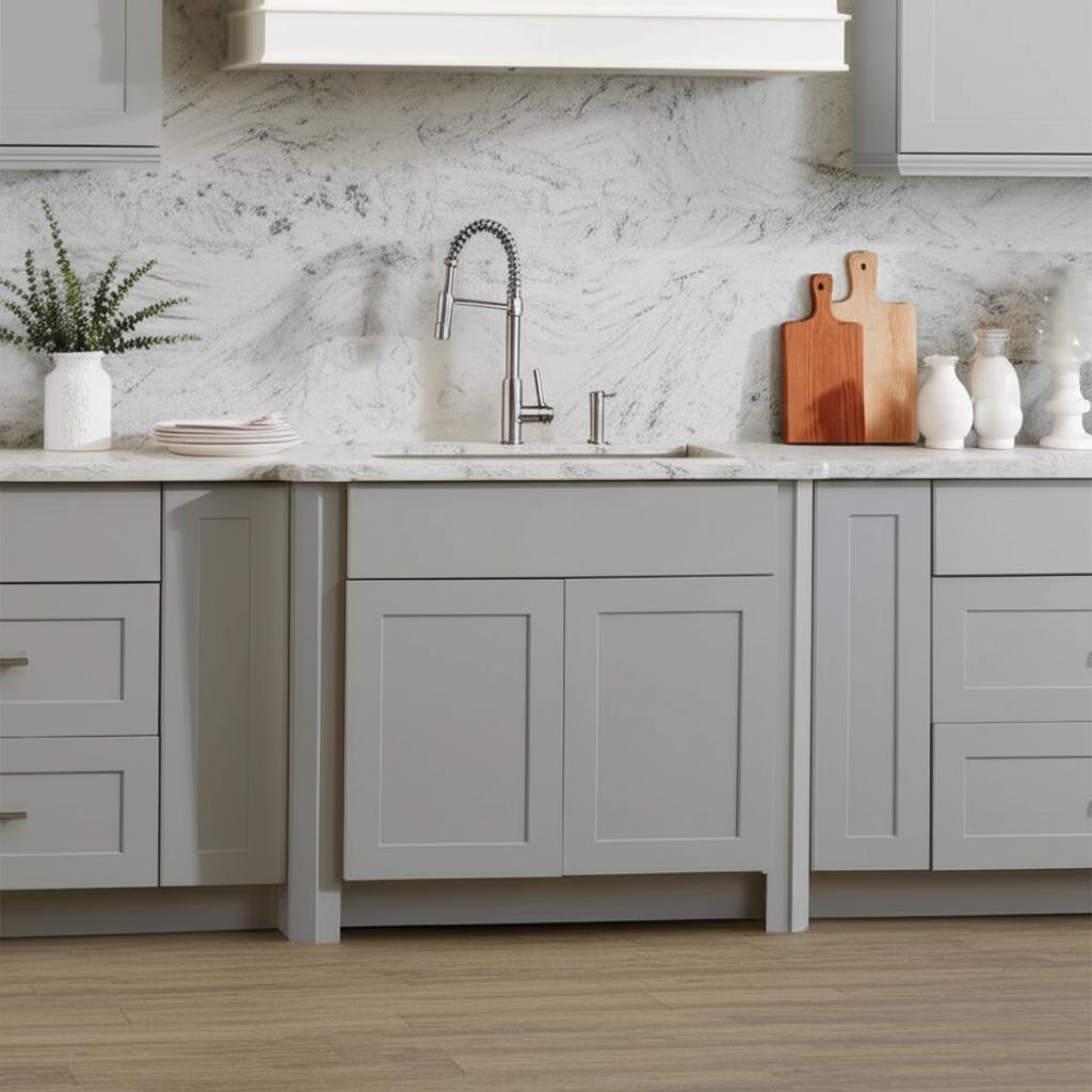 • Stylish Design: Gray Shaker style doors and slab drawer complement modern spaces.