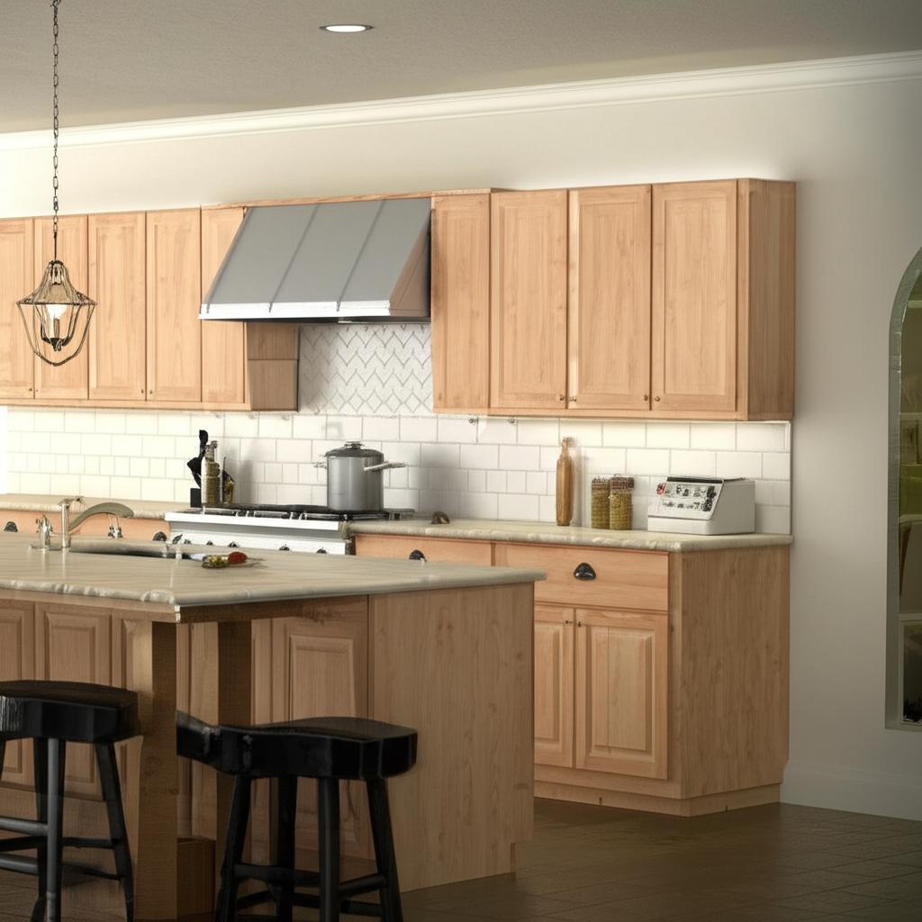 Transform your kitchen into a masterpiece of rustic allure with the Hampton Bay Natural Hickory Wall Kitchen Cabinet. Its exquisite hickory finish and raised door panel detail evoke a sense of timeless charm, perfect for creating a warm and inviting atmosphere. Style this cabinet alongside open shelving with your collection of vintage dishware to accentuate its traditional appeal. Whether part of a full kitchen design or a singular statement piece, this cabinet marries functionality with luxury, essential for sophisticated home interiors.