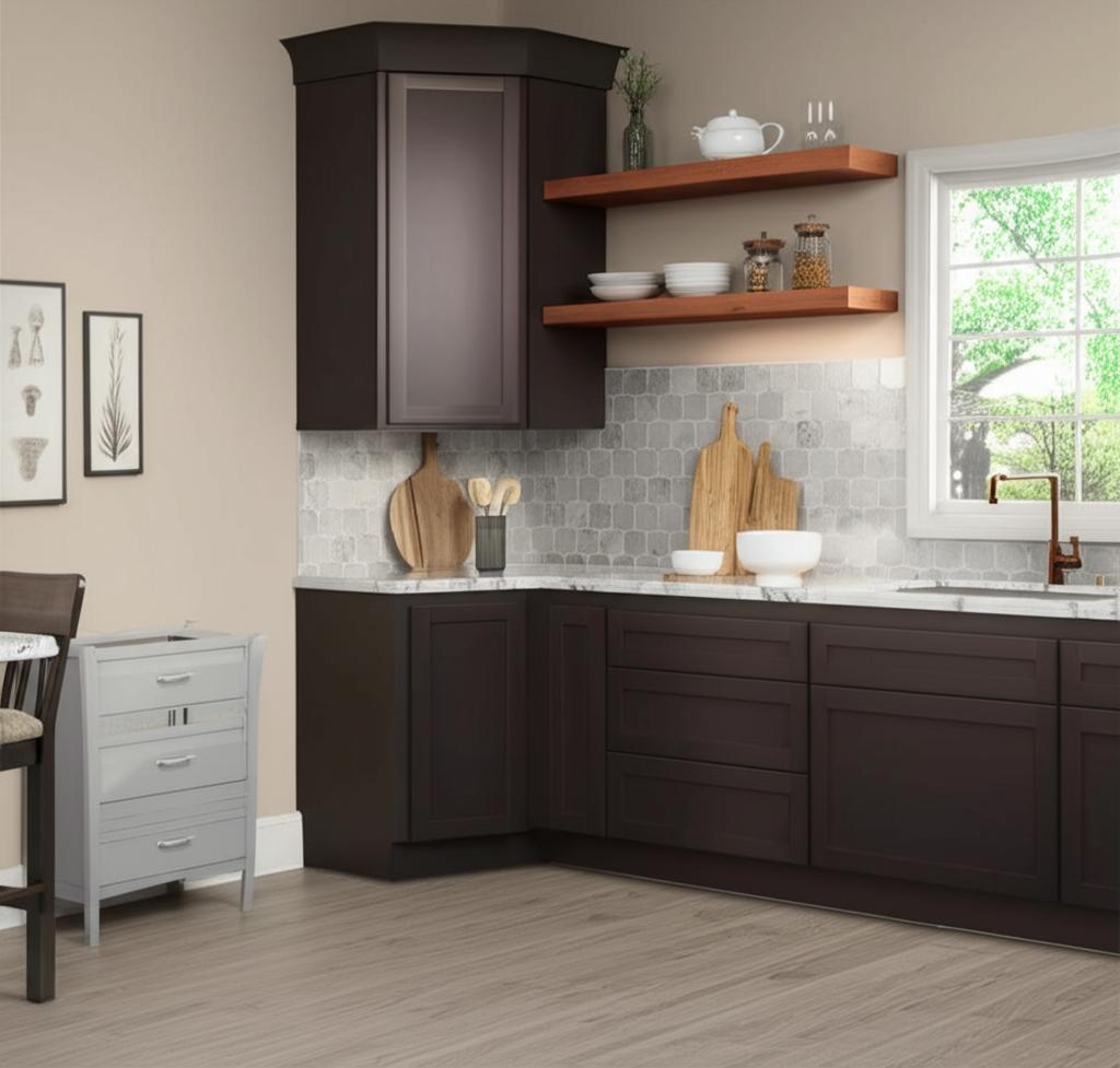 Elevate your kitchen's appeal with the Hampton Bay Java Corner Cabinet—order now to create a cornerstone of elegance in your space.