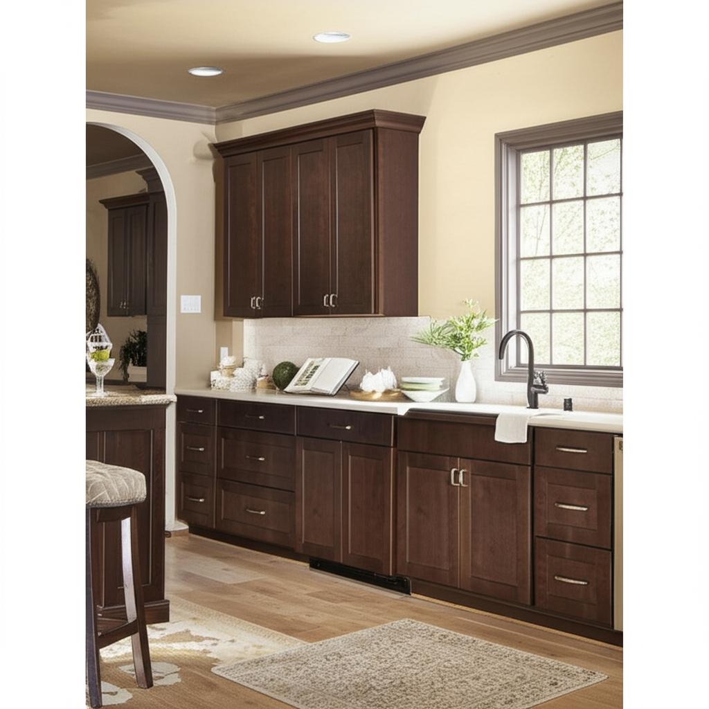 The Hampton Bay Shaker Wall Kitchen Cabinet transforms your kitchen with its rich Java finish and minimalist Shaker design. Its adjustable shelves and reversible door offer both practicality and style, making it a versatile addition to any decor. Pair it with contrasting hardware or backsplash tiles to create a stunning visual impact. This cabinet is a perfect blend of functionality and luxury, essential for a sophisticated kitchen space.
