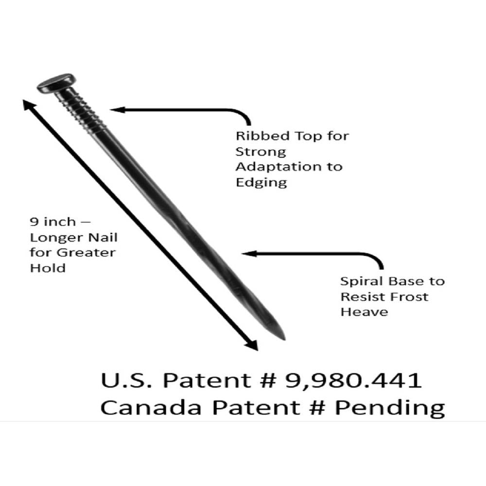 The most innovative 9 in poly nails in the marketplace. Spiral tip for use with multiple soil conditions. Ribbed top helps prevent heaving in frost prone geography's. 100 per box. Black color. Use caution when striking. Protective eye wear and gloves recommended.