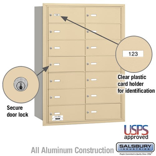 This USPS-approved rear-loading mailbox features 14 B-size doors, durable aluminum construction, and a sandstone powder-coated finish, making it ideal for apartments and commercial buildings.