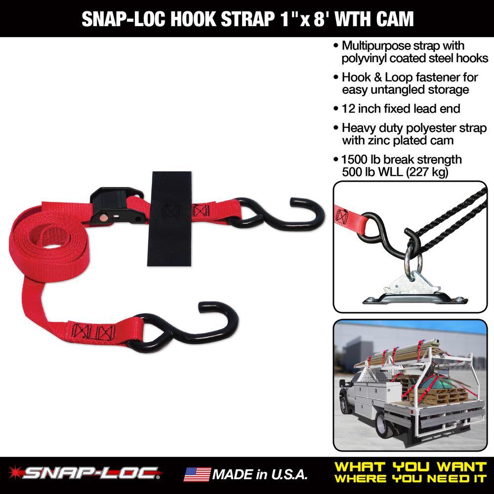This S-Hook strap will outlast and outperform any cheap import strap! Includes 12 in. lead end with quick release Cam buckle, 8 foot overall length, S-Hook ends and sewn on Hook and Loop fastener for easy storage. Strap has an enormous 1500 lb. break strength, 500 lb. working load and is made from long lasting heavy duty polyester webbing. SNAP-LOC also offers a variety of System Accessories and other Straps for most every type of application. SNAP-LOC is Ultimate Cargo Control.