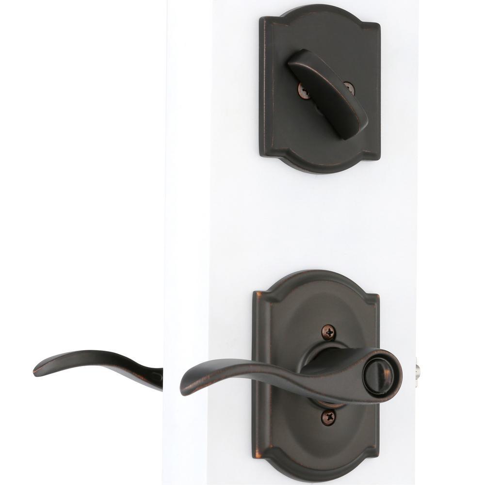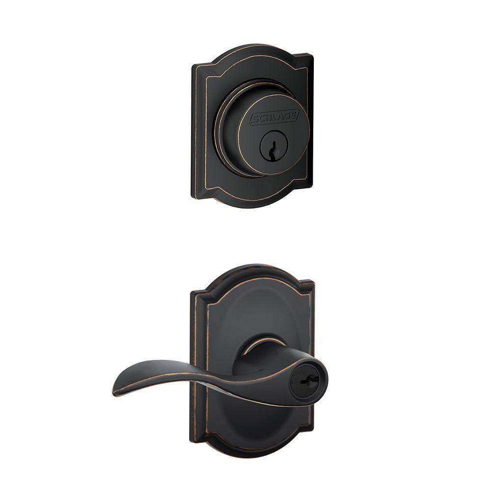 The Schlage Camelot Aged Bronze Single Cylinder Deadbolt with Accent Entry Door Lever Combo Pack is perfect for use on exterior doors where extra security is needed. The Accent lever features an elegant wave-like design that effortlessly matches any room's style, and the deadbolt adds an extra layer of Grade 1 security. Its Aged Bronze finish features warm, copper tones that break through its darker, aged exterior. The lever unlocks when the door is opened from the inside, allowing you to leave quickly and conveniently and re-enter easily. Plus, it was designed and tested with strength and durability in mind.