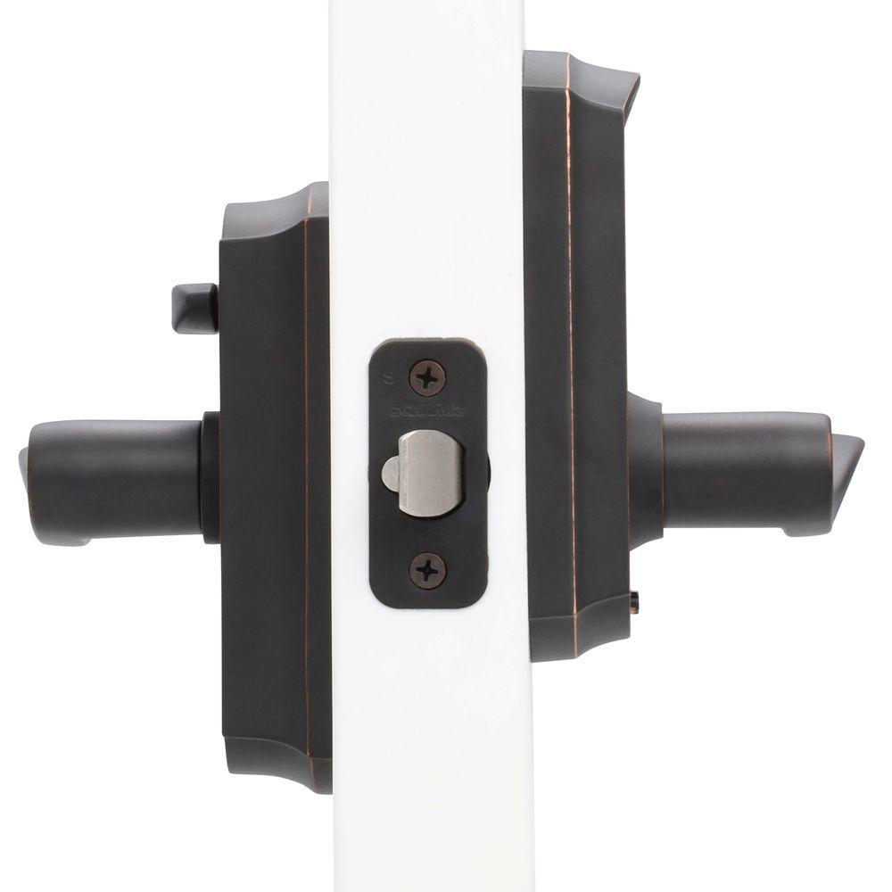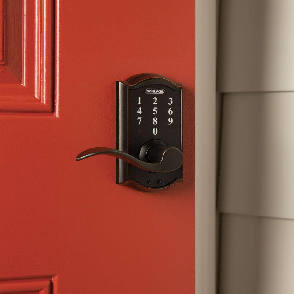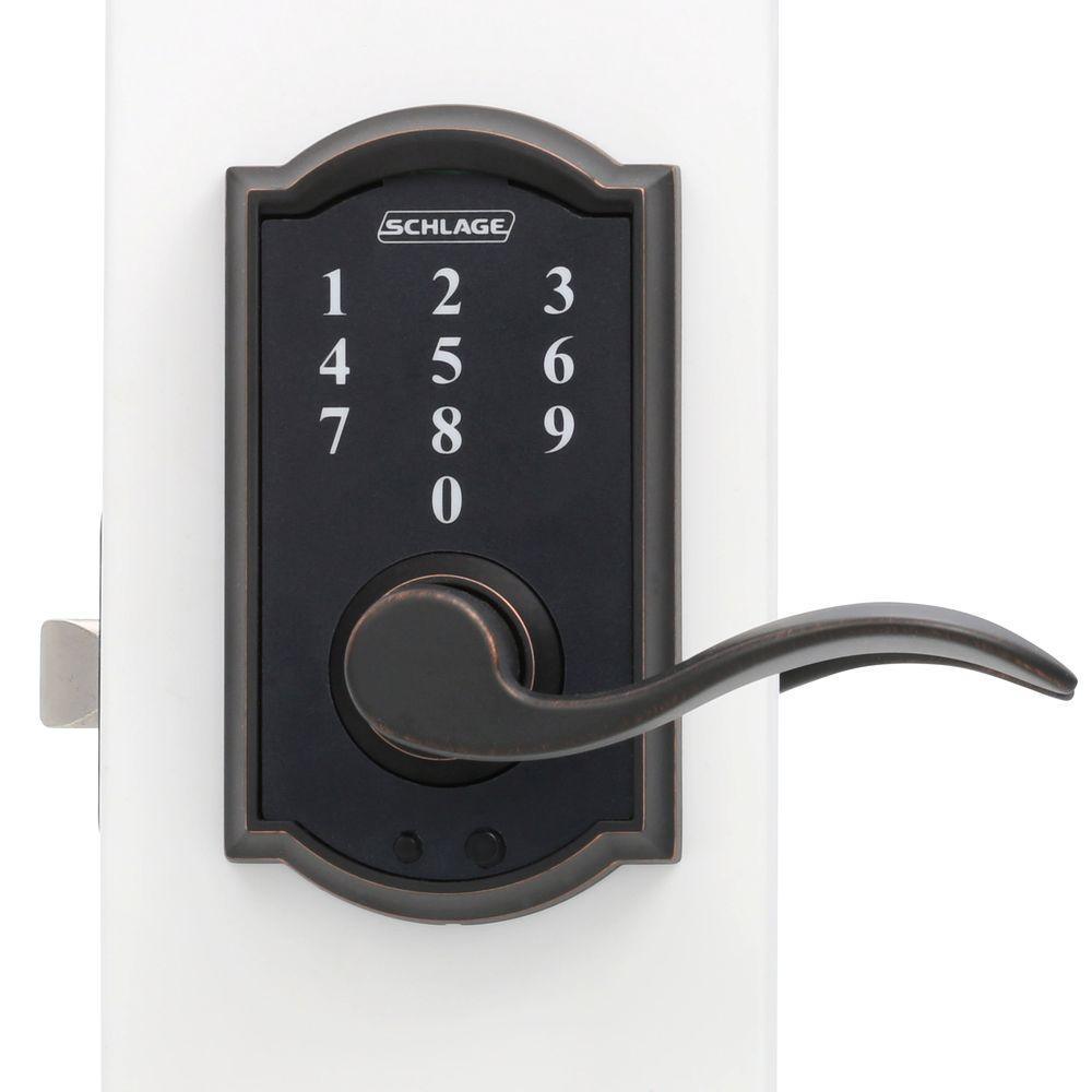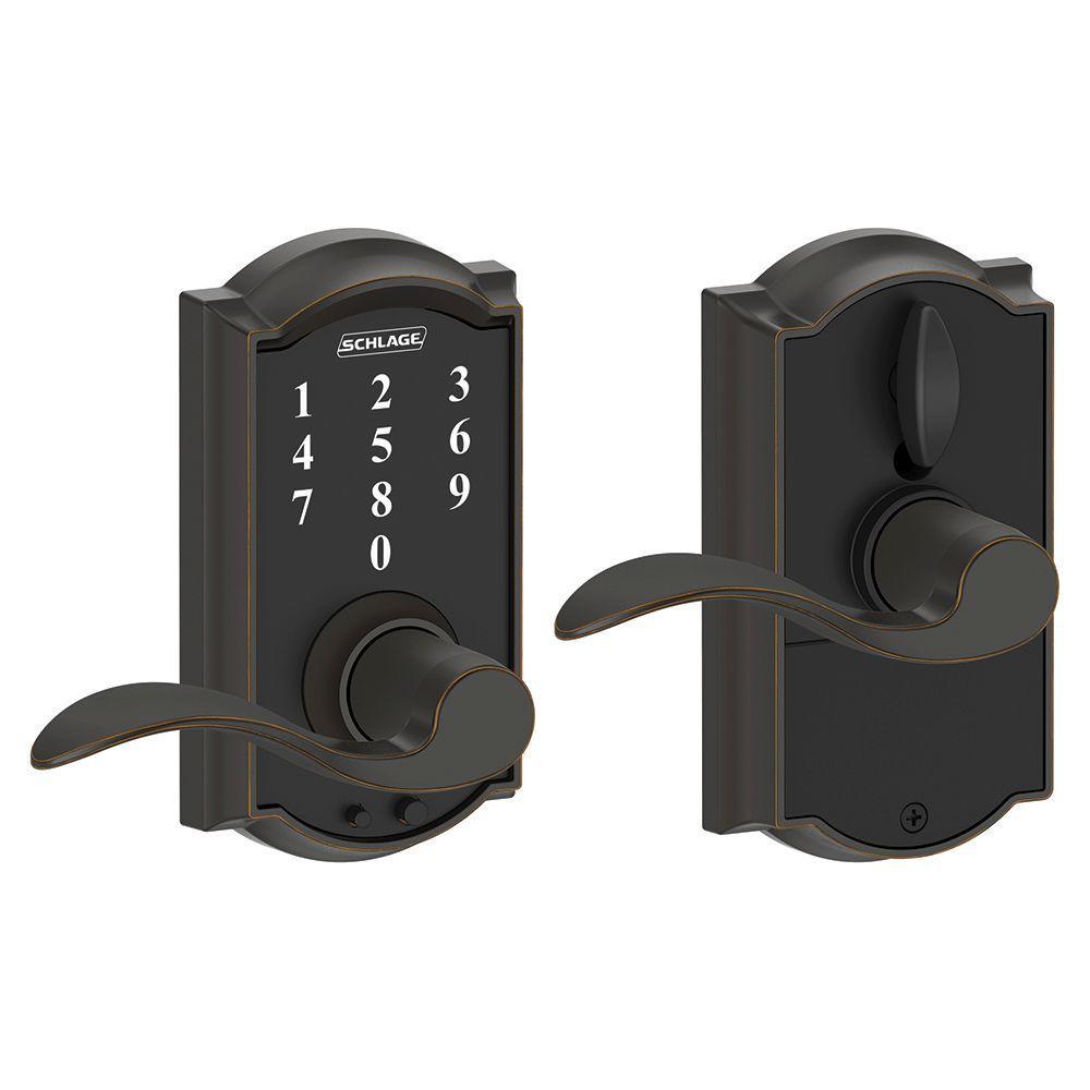 Eliminate the hassle of house keys with the Schlage Accent Aged Bronze Touch Electronic Door Lever with Camelot Trim. There's no key to lose, no re-keying or cutting new keys - no keys at all, thanks to our cylinder-free design. The LED backlight keypad is able to hold up to 19 different user codes for your convenience, and is fingerprint resistant. Also, this electronic door lever runs on a single 9-volt battery, which is included. All in a slim profile and stylish trim that pairs perfectly with interior hardware. The Accent lever is widely popular for its elegant wave-like design that effortlessly matches a home's style without overshadowing it, while the Camelot trim's scalloped architectural details add charm to any home. Our Aged Bronze finish is inspired by traditional design, featuring warm, copper tones that break through its darker, aged exterior. Plus, it's been designed and tested with strength and durability in mind.