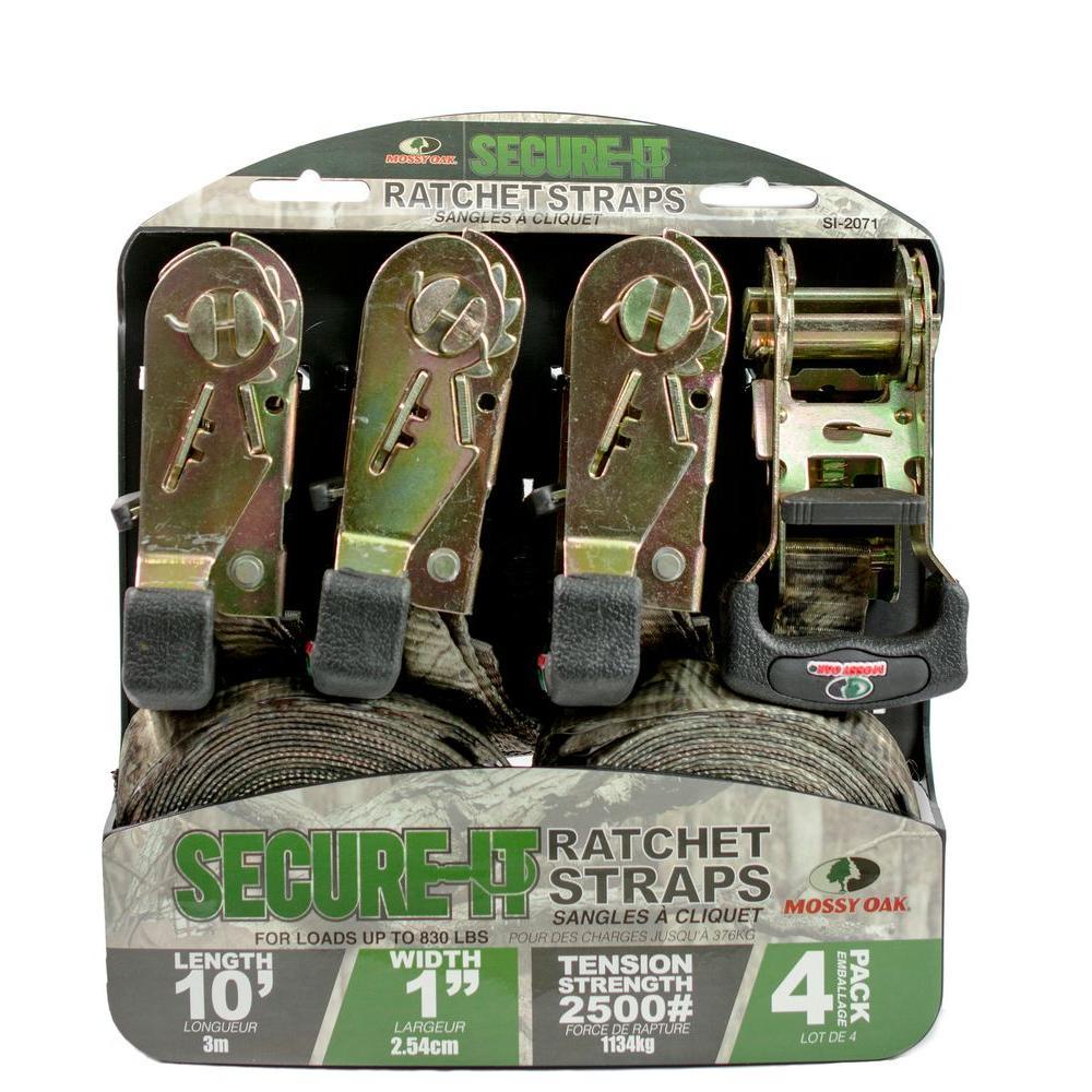 Secure-Its Mossy Oak Ratchet Strap Kit offers 4 great ratchet straps, constructed of licensed Mossy Oak Break-Up Infinity camouflage. The 4 strap, with convenient J-hook ends, each measure 1 in. W x 10 ft. L, have a tension-strength of 2,500 lbs., and work-load strength of 830 lbs.
