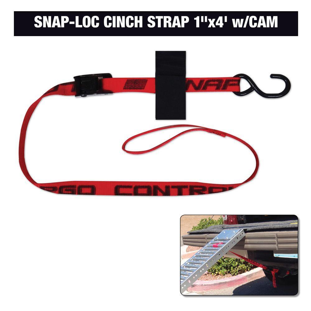 This strap is used to secure our Truck and Trailer Ramps and is also great for all types of quick tie down applications! Includes 12 inch lead end with quick release Cam buckle, 4 foot overall length, S-Hook end, loop end that ties on items and sewn on Hook and Loop fastener for easy storage. Strap has an enormous 1500 lb. break strength, 500 lb. working load and is made from heavy duty polyester webbing. Snap-Loc also offers a variety of System Accessories and other Straps for most every type of application. Snap-Loc is Ultimate Cargo Control.