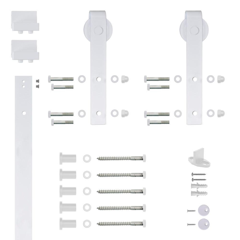 • Kit comes with all the parts needed to hang up to a standard 36 in. door, one 78 in. rail, 5 wall mounting brackets, 2 roller straps, 1 center guide, rail stops and 2 anti-jump block (door not included)