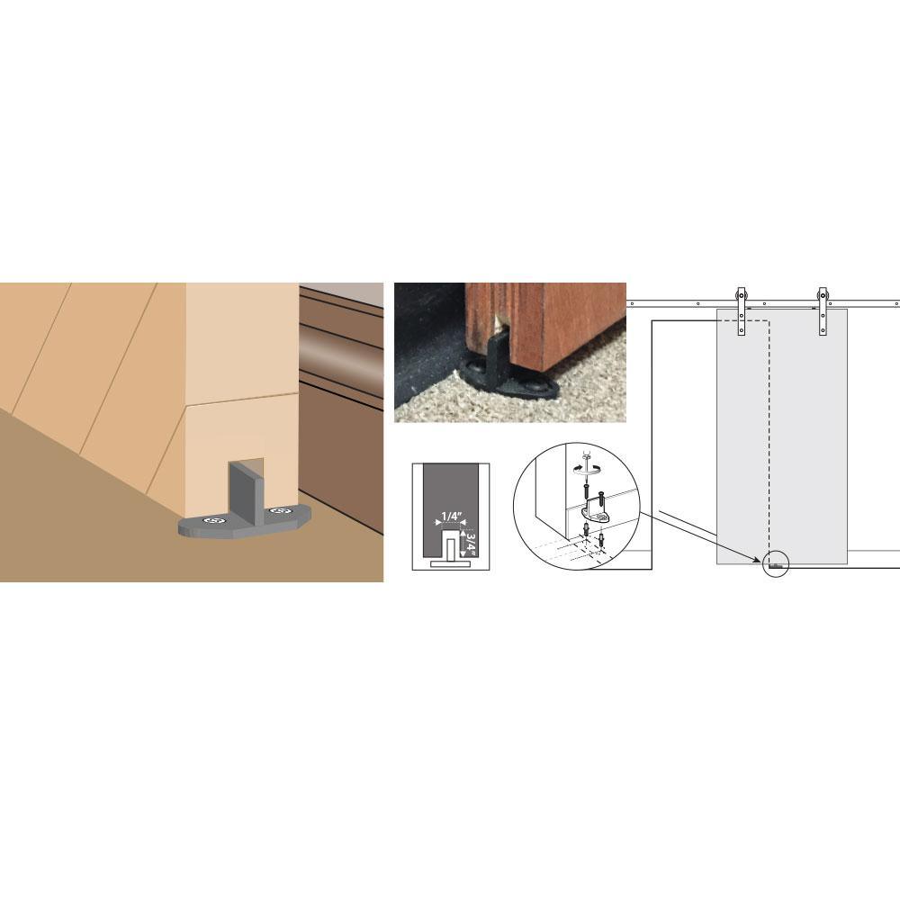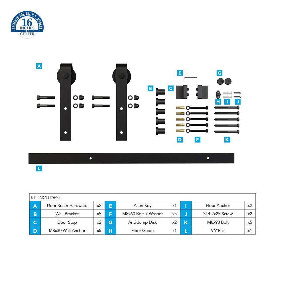 • Kit includes: 1 flat rail (96 in. x 1-1/2 in. x 3/16 in.), 2 door rollers, 2 door stops, 1 floor guide (to be routed into bottom of door), 6 wall brackets, 2 anti-jump disks and screws