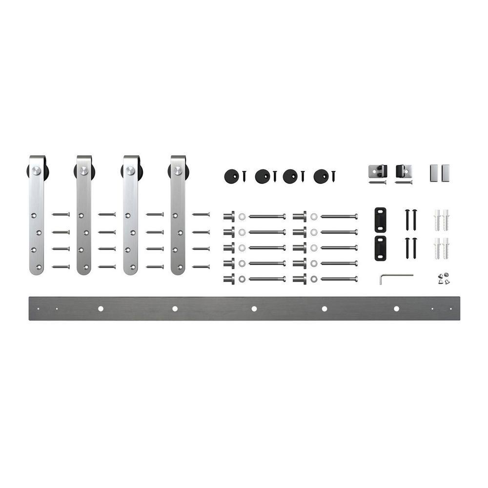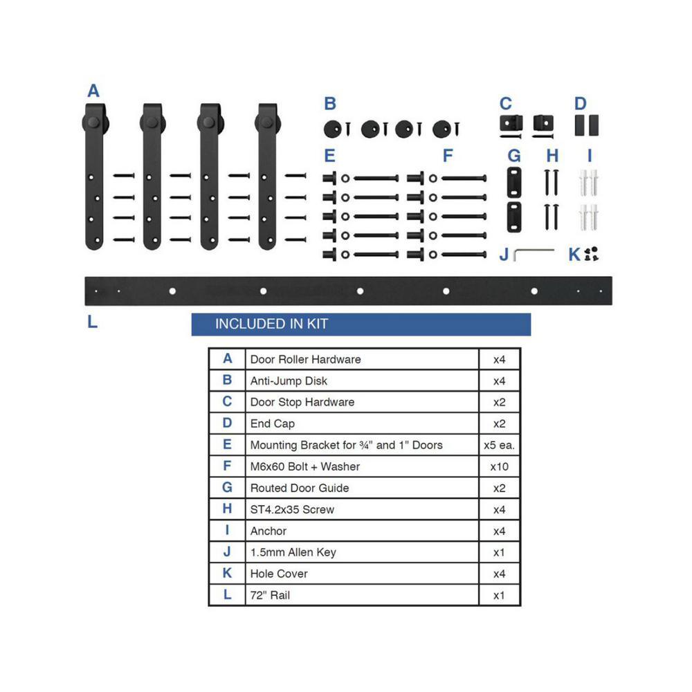• Kit includes: rail 1 in. x 72 in. L, 5 mounting brackets, 4 door rollers, 2 door stops, 4 anti-jump discs, 2 metal end caps, 2 routed type floor guide and mounting hardware
