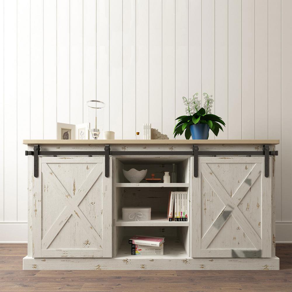 Our 6 ft. Black Solid Steel Mini Sliding Rolling Barn Door Hardware Kit for Double Furniture Wood Doors are is perfect for kitchen cabinets, bathroom vanities, hidden TV Solutions, buffets, armoires, dressers and more. Our small barn door hardware can accommodate furniture doors up to 44 lbs. and from to 1 in. thick. This kit provides exceptional quality and design. It allows you to customize the length of your rails by using a band saw or hack saw. 72 in. Rails are field trimmable to 68 in. Once cut cover the ends with our Mini Metal End Caps. This kit also allows you to extend the length of your rail up to 48 in. by purchasing a matching Rail Extension Kit. Kits includes mounting brackets for either 3/4 in. or 1 in. door thickness.