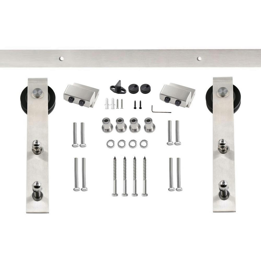 Delaney's 6 ft. Barn Door 1000 Series Hardware Kit in satin nickel finish adds a distinctive, stylish upgrade to your home while optimizing space. Our barn door hardware delivers quiet wheels and durability to hold up to 330 lbs. Includes everything needed for installation making the process quick and hassle free. Steel construction and quality craftsmanship ensure that you will enjoy this product in your home for years to come. Kit includes, 2 hangers with quiet bearing wheels, 1 pre-drilled track, 6 standoffs and 6 lag bolts, 2-door stops, 1-door guide, 1 anti-jump disc, 6 bolts, 6 nuts and 6 washers. For single doors 1-3/8 in. and 1-3/4 in. T.