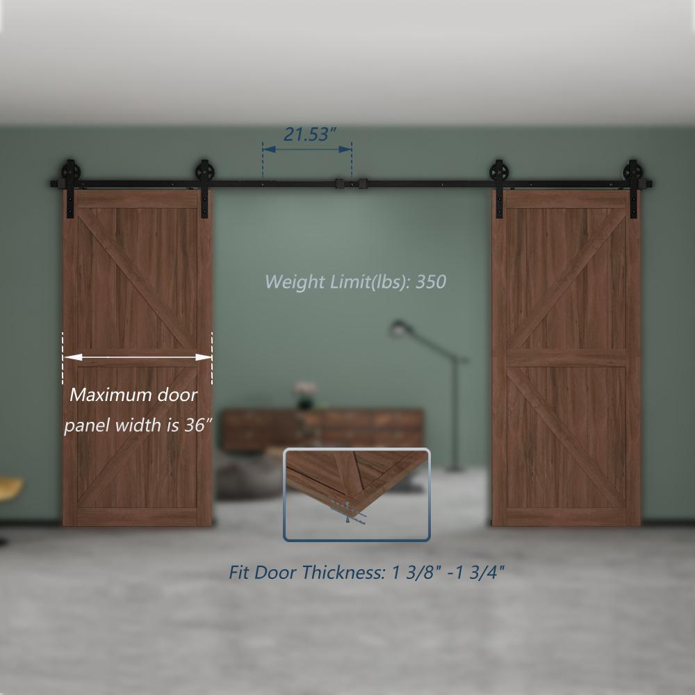 • Pre-install notice: only the hardware is for sale, doors are not included the hardware package has lag bolts for wooden wall/drywall/concrete wall our sliding barn door hardware kit is compatible with door thickness from 1-3/8 in. to 1-3/4 in. if you have a door trim, you would better put a header board that is as thick as the trim and then attach the rail to the header board you need to have at least 8 in. of space between the top of the door to the ceiling to accommodate the hardware we use 2 hangers to hold 1 door, for a single door kit, there will be 2 hangers in the package for a double door kit, there will be 4 hangers, if you have a door that is either too wide or too heavy, then you can purchase additional hangers for that door