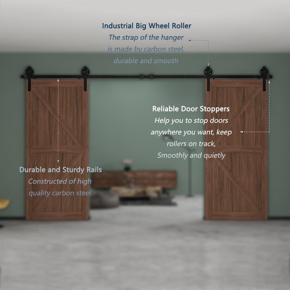 12 ft./144 in. Black Steel Sliding Barn Door Track and Hardware Kit for Double Doors with Floor Guide Bigwheel J Shape)