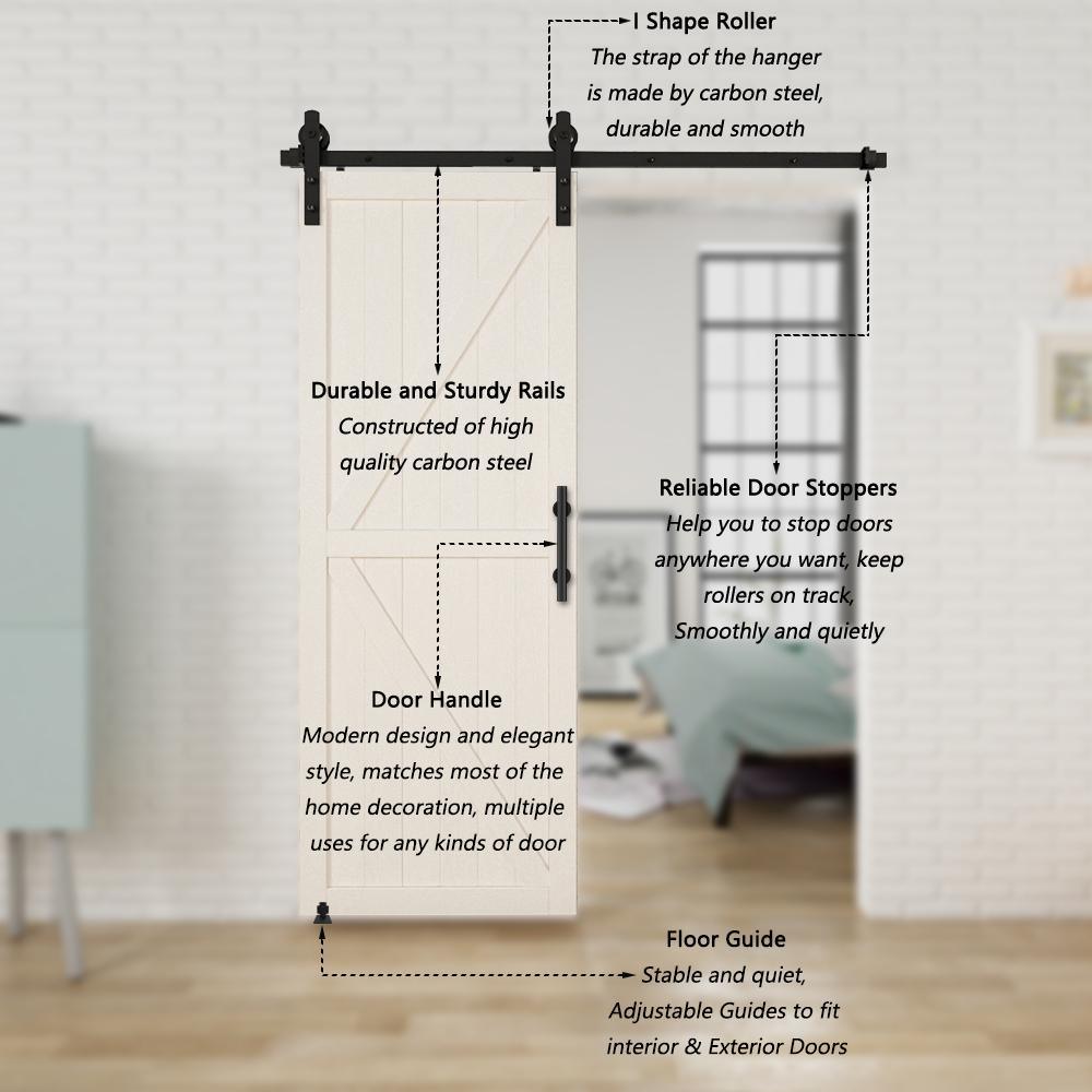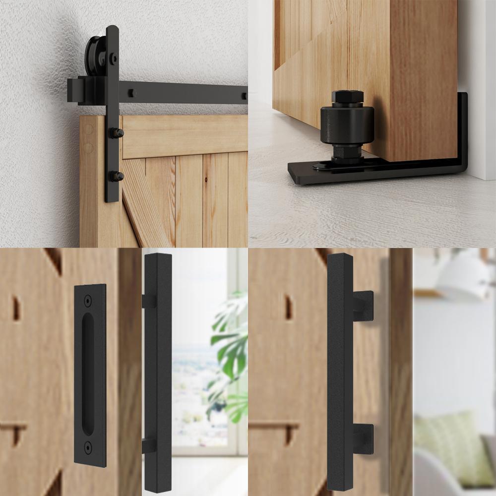 • Package included: barn door hardware kit, (1 x 5 ft. rails, 2 x hanger, 4 x rail spacer, 1 x 12 in. square pull handle set, 1 x single roller floor guide, 1 x T-shaped floor guide, 2 x door stop, 2 x end cap, 1 x hex key) all assembly hardware is included as you see in the pictures, door not included