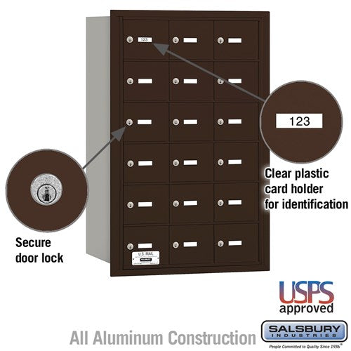 This USPS-approved rear-loading mailbox features 18 secure A-size doors, a durable bronze powder-coated finish, and sturdy aluminum construction, making it ideal for residential and commercial use.