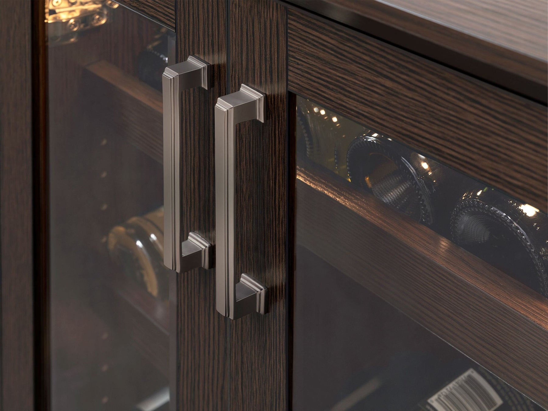 Transform your living space with a bar cabinet that exudes both elegance and practicality. The NewAge Brown Rectangle Bar Cabinet features a striking espresso finish that effortlessly harmonizes with diverse décors. Its shaker-style doors and brushed nickel accents offer a cohesive design language that speaks to both functionality and style. Display your finest glassware atop adjustable tempered glass shelves, and let it become the centerpiece of your festive evenings. A true testament to luxurious living, this cabinet invites you to entertain with confidence and flair.