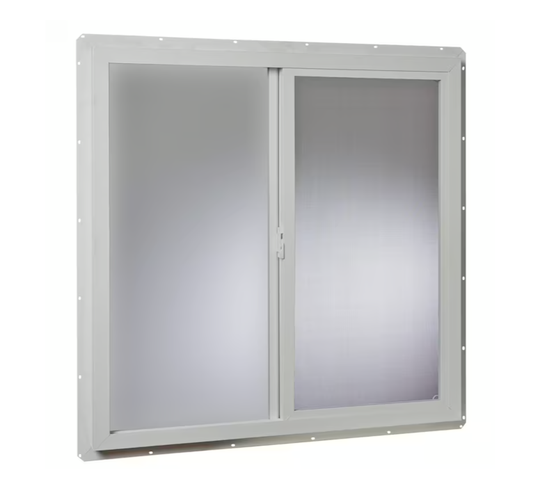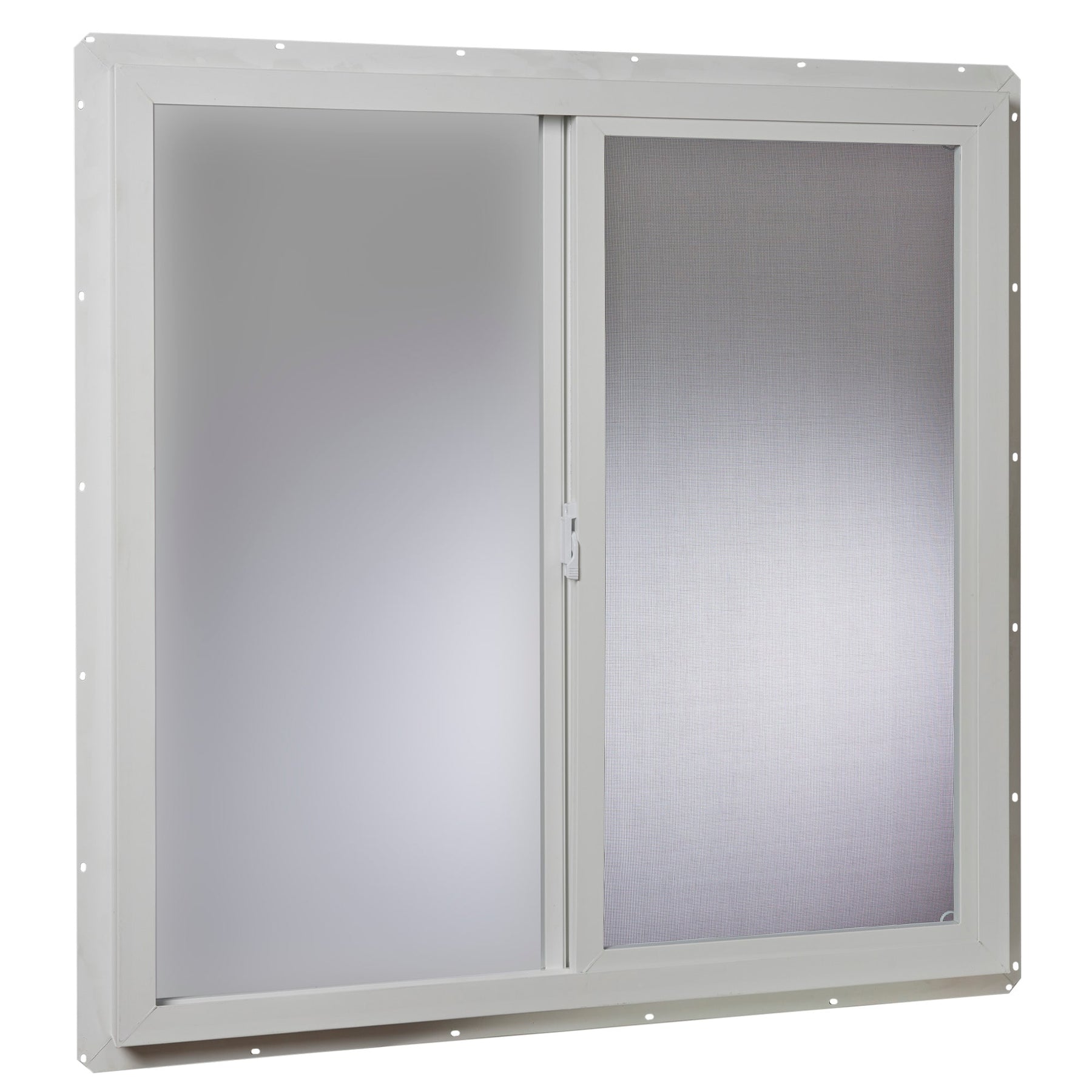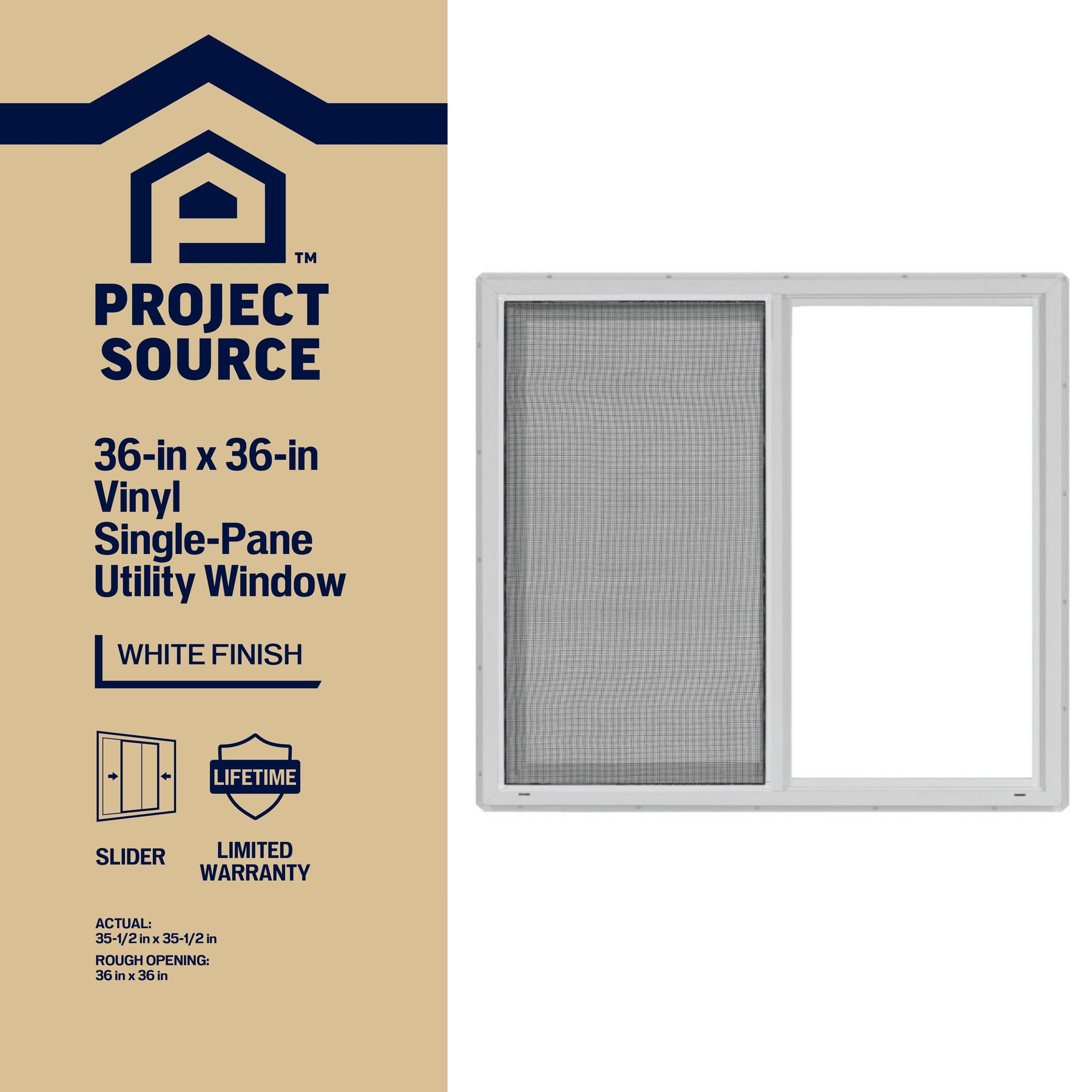 This Project Source vinyl sliding window is ideal for garages, porches, barns, and steel buildings. It features a solid welded main frame and sash construction, along with a rigid vinyl mounting flange and interlocking panels for a weather-tight seal. The built-in J-channel is compatible with all types of siding and finishes. This window measures 35-1/2 inches wide by 35-1/2 inches high, with a rough opening of 36 inches wide by 36 inches high.