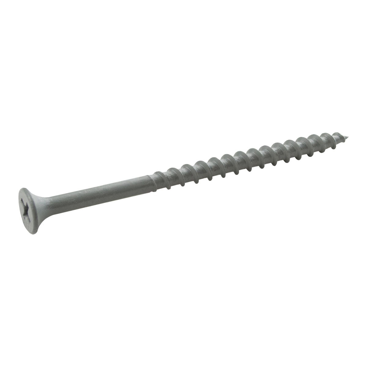 Grip-Rite PrimeGuard Ten exterior deck screws are steel fasteners with a gray polymer finish designed for outdoor wood-to-wood projects. The #10 x 3-in screws feature coarse threads, a sharp point, and a countersinking head for smooth, clean installations.