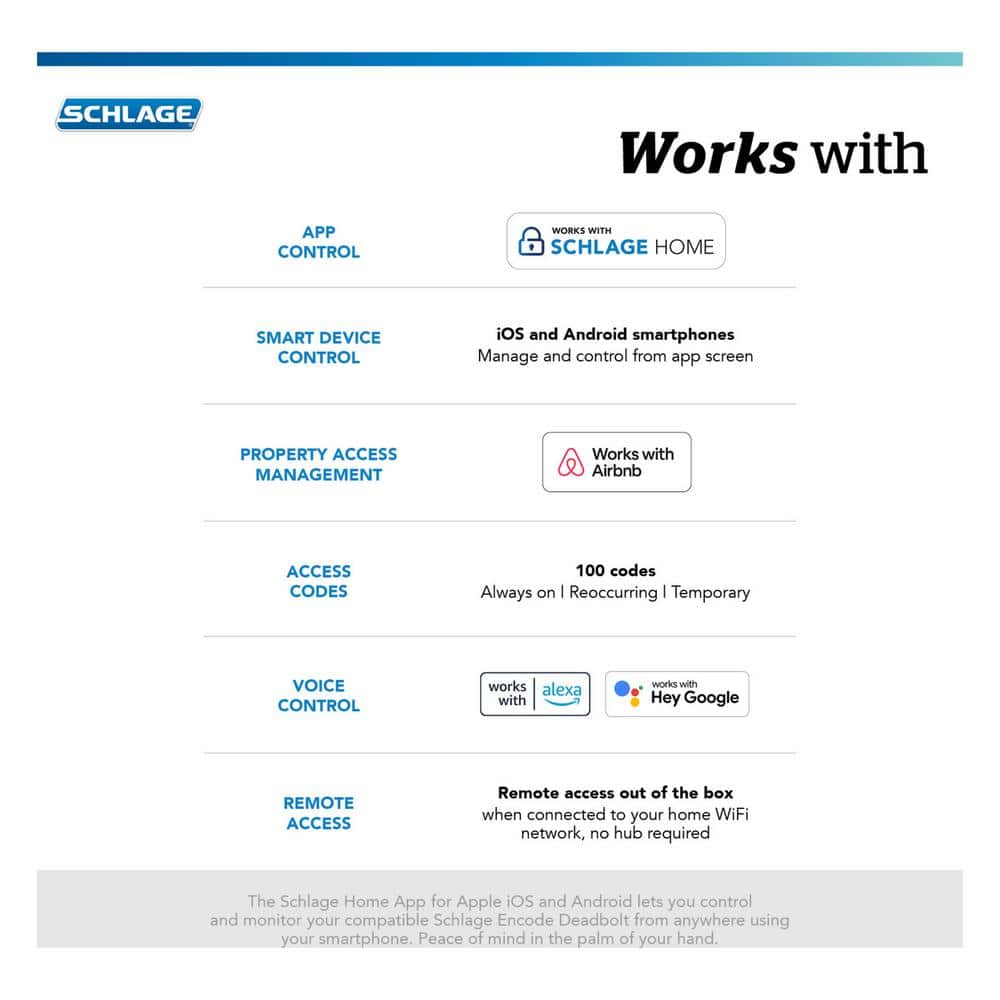 | Works With | Alexa, Google Assistant, Ring, Proprietary App (Schlage Home), Homey |