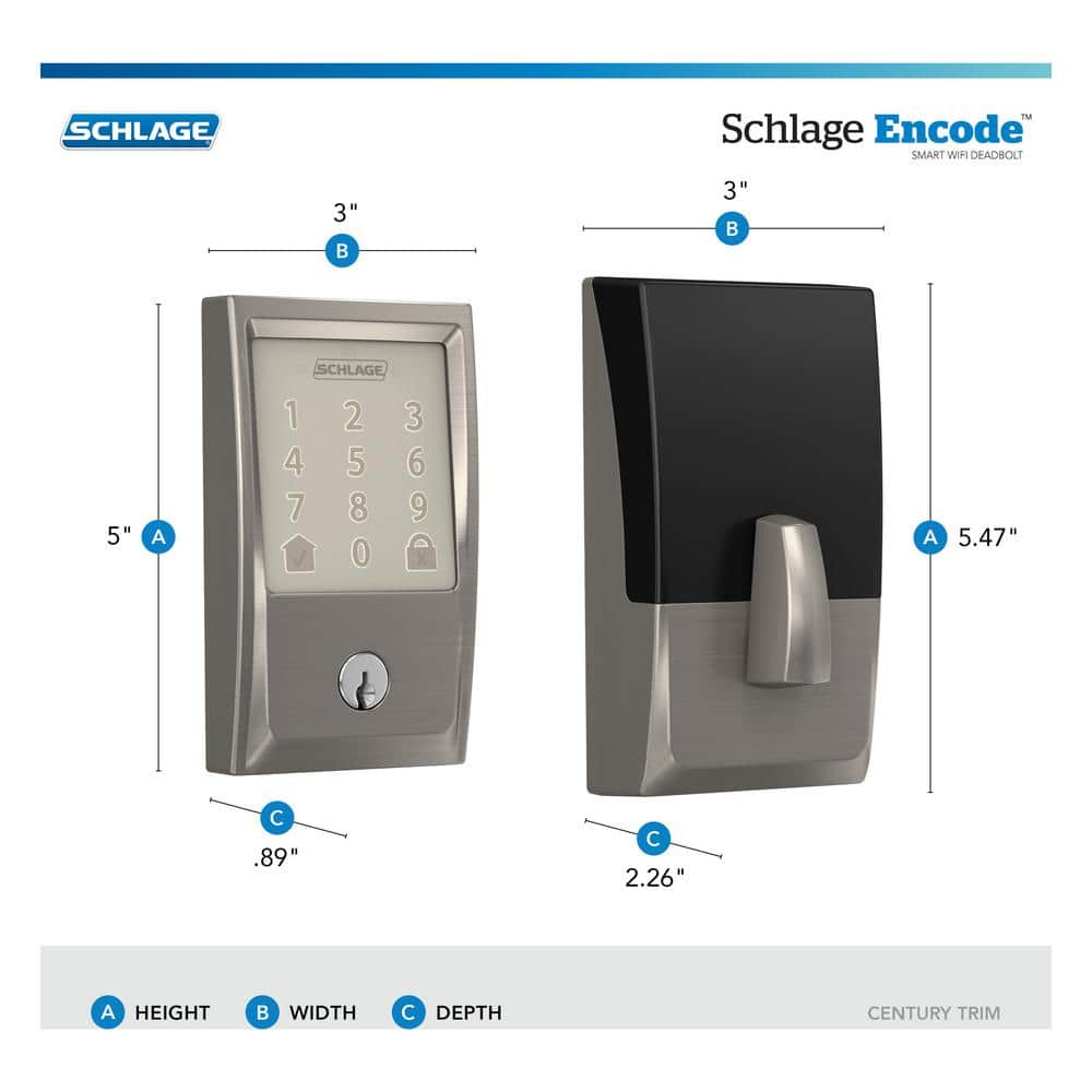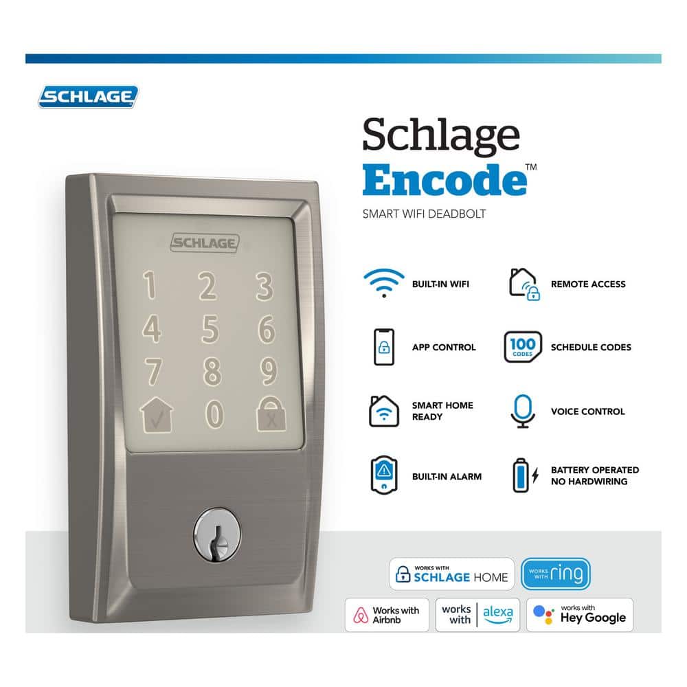 Schlage Century Encode Smart Wi‑Fi Door Lock with Alarm & Latitude Lever Handleset – Satin Nickel
