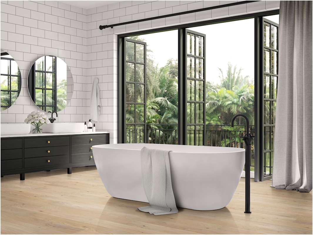 Estate Oak whispers sophistication—those elongated 6.5-inch planks lay a serene, continuous foundation that anchors the room with effortless polish. The low-gloss finish lets the wood’s subtle grain take center stage, adding depth without glare. Pair it with layered neutrals and brushed black hardware to heighten the modern, edited vibe. It’s the kind of floor that makes every space feel custom and unmistakably elevated.