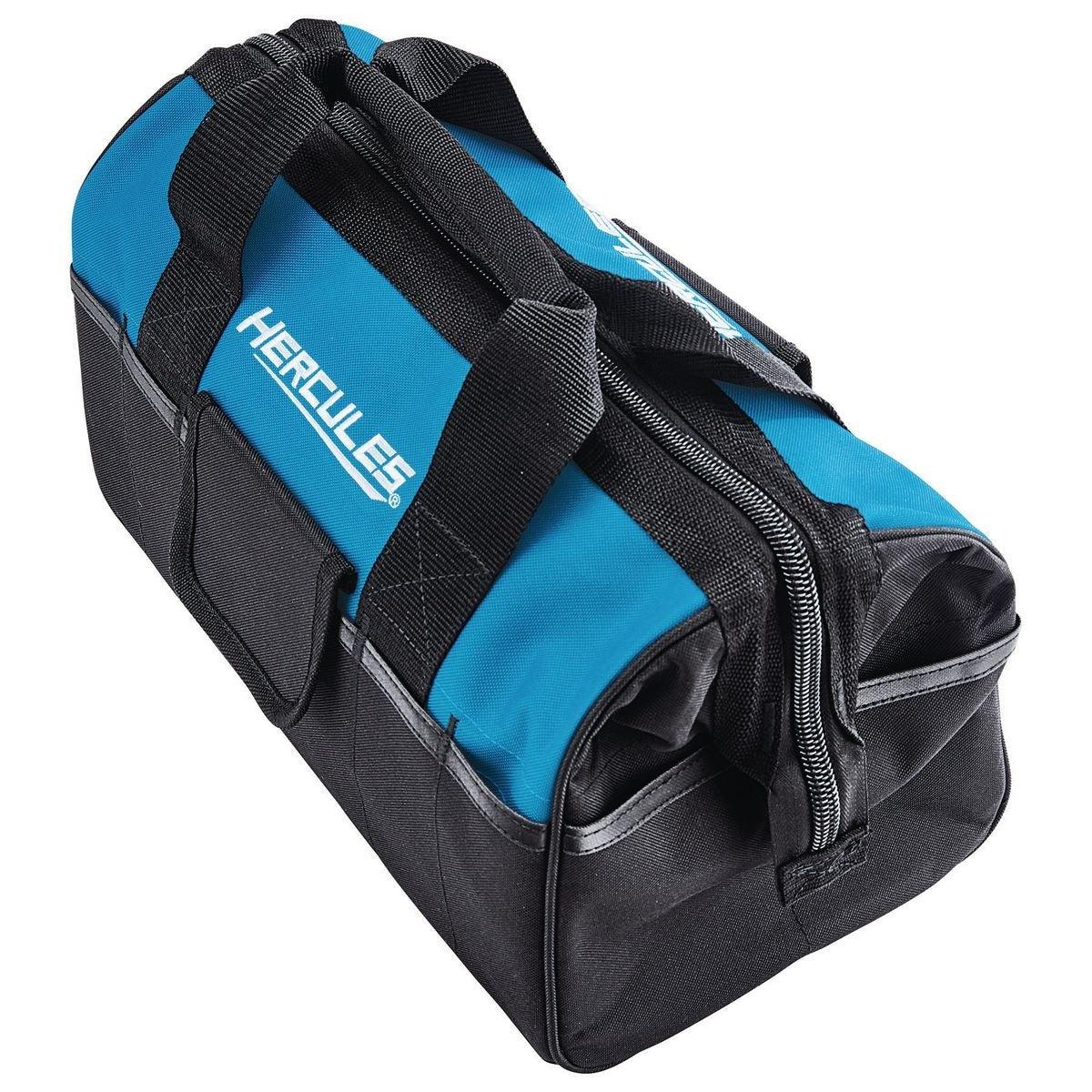 A compact, durable Hercules tool tote designed to organize essentials on the job. Features heavy-duty stitching, reinforced handles, and water-resistant polyester with a zippered main compartment and 15 pockets for batteries, chargers, and accessories.