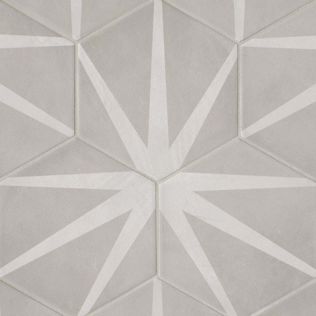 Italian-made matte porcelain hexagon tile featuring the Stella star-pattern deco. Ideal for walls and floors, it blends neutral grays and whites to create modern geometric statements in bathrooms, kitchens, and living spaces.