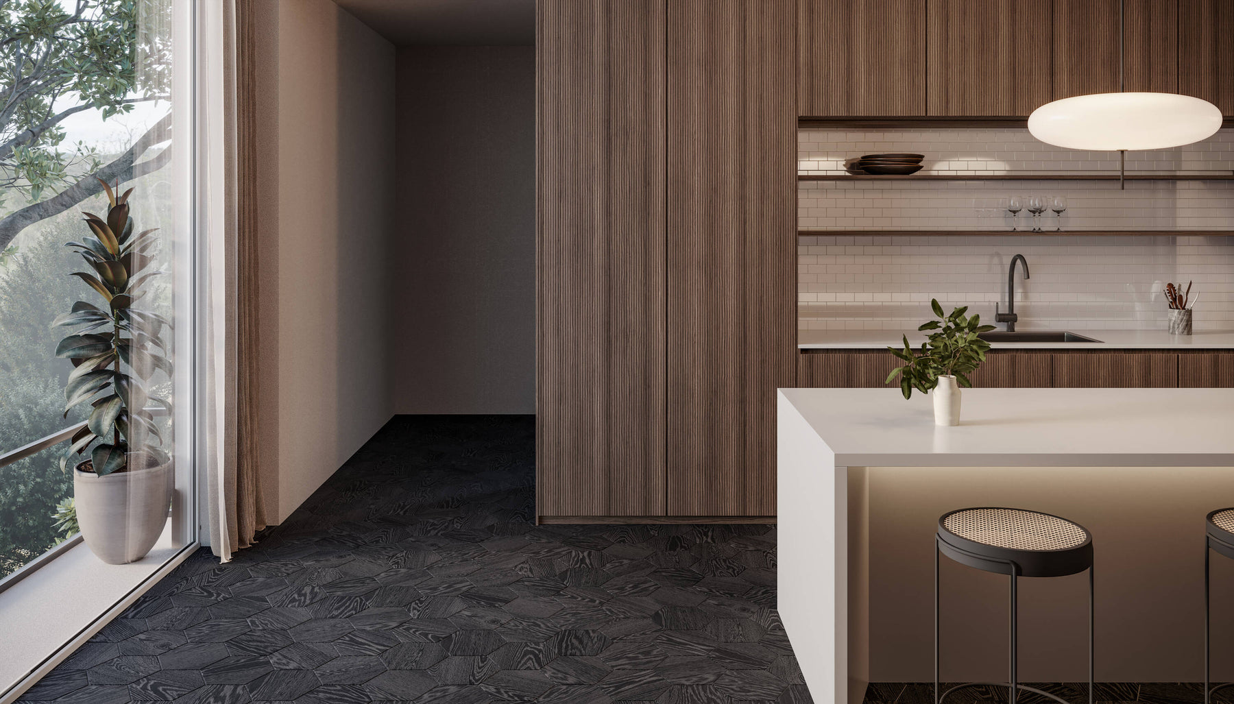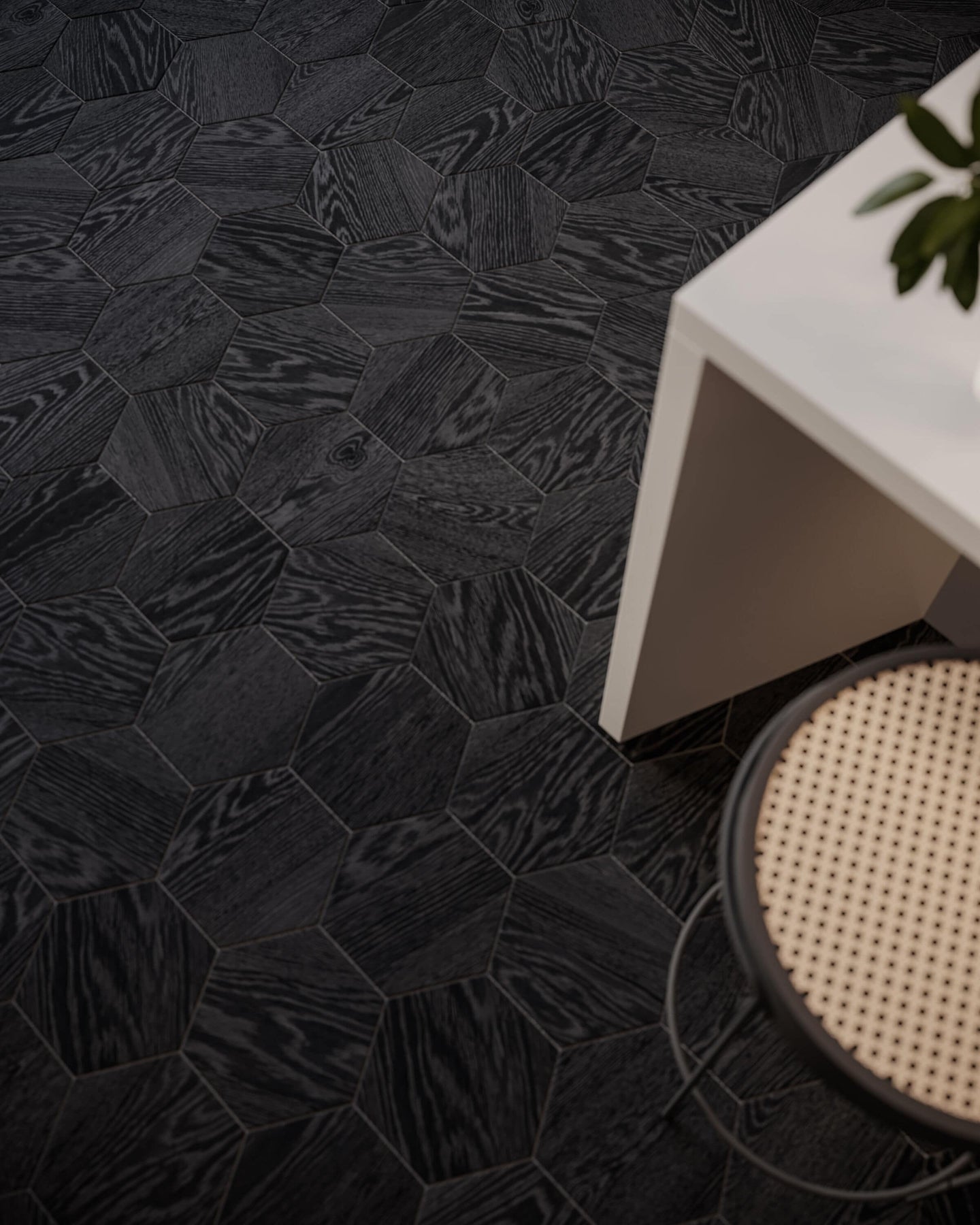 Imagine a space where art meets architecture, where the rich tone of Sedona Midnight envelops your senses in luxury. These matte hexagon tiles, with their subtle wood-look finish, transform any room into a haven of modern elegance. Picture them as a stunning backsplash in your kitchen, creating a seamless flow with open shelving. Essential for those seeking refined sophistication, these tiles serve as a foundation for an undeniably luxurious lifestyle.