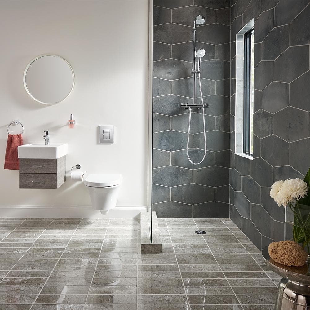 This deep gray porcelain hexagon ushers in a sophisticated, urban sensibility with its softly matte, concrete-inspired surface. The elongated hex shape adds graphic drama and rhythm, transforming shower walls or kitchen backsplashes into sculptural statements. Pair it with crisp white grout to accentuate the geometry, or soften the look with tonal grout for a seamless sweep. It’s a chic essential for luxurious, modern living.