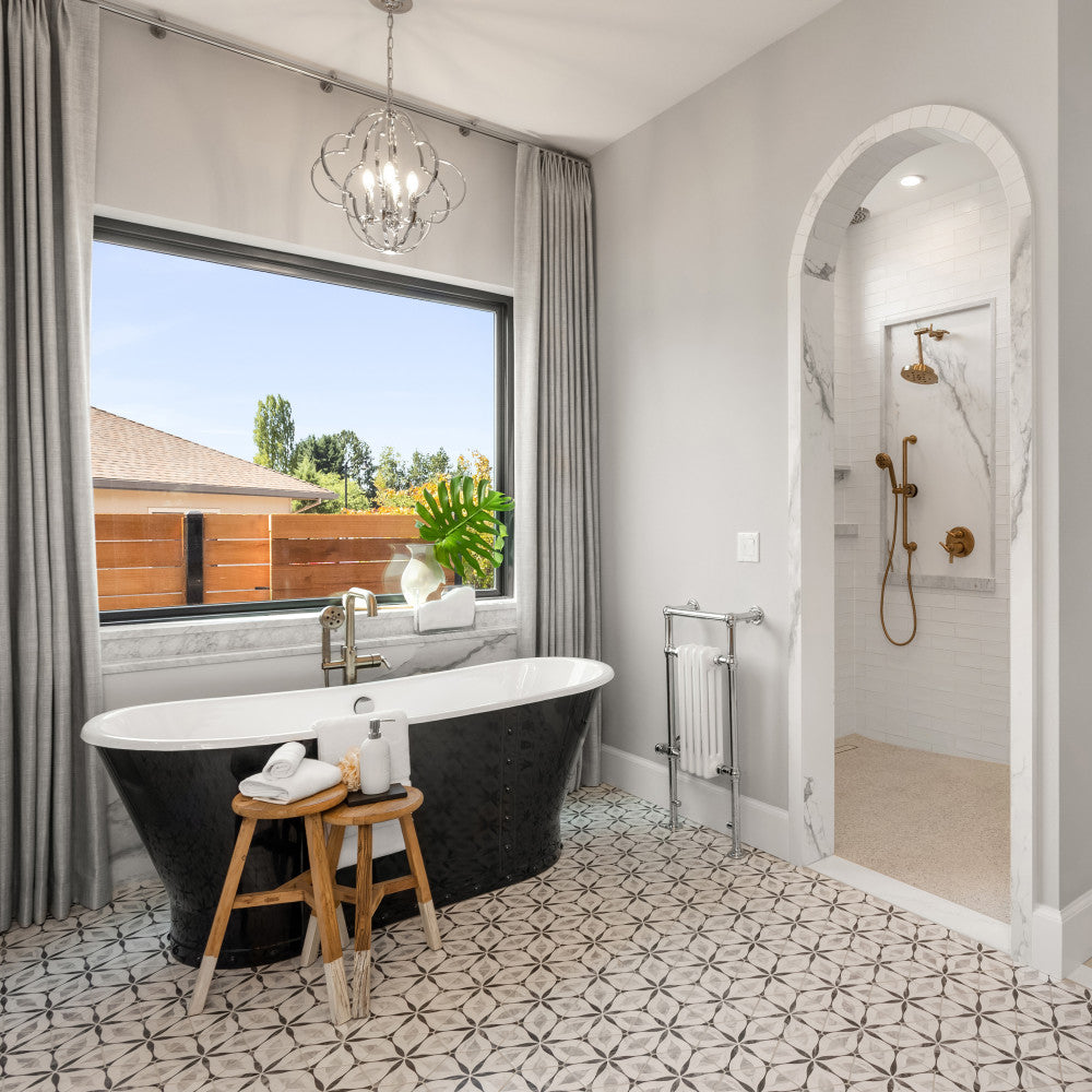 This porcelain hex blooms across the room with a crisp, marble-kissed flower pattern that feels both graphic and refined. The satin finish and subtle texture catch the light softly, creating movement underfoot. Style it with warm brass and soft gray walls for a chic spa vibe, or pair with white cabinetry to let the motif sing. It’s a polished statement piece that brings luxury to everyday living.