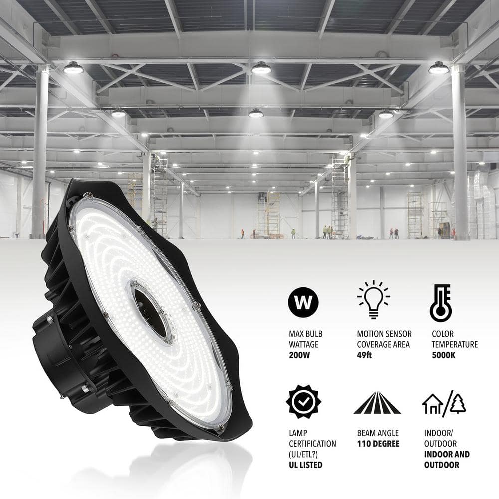 JONATHAN Y 200-Watt Equivalent Integrated LED Motion Sensor Black High Bay Light Indoor/Outdoor UFO Light 26000 Lumens 5000K