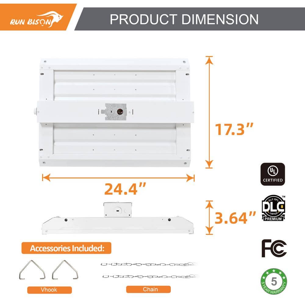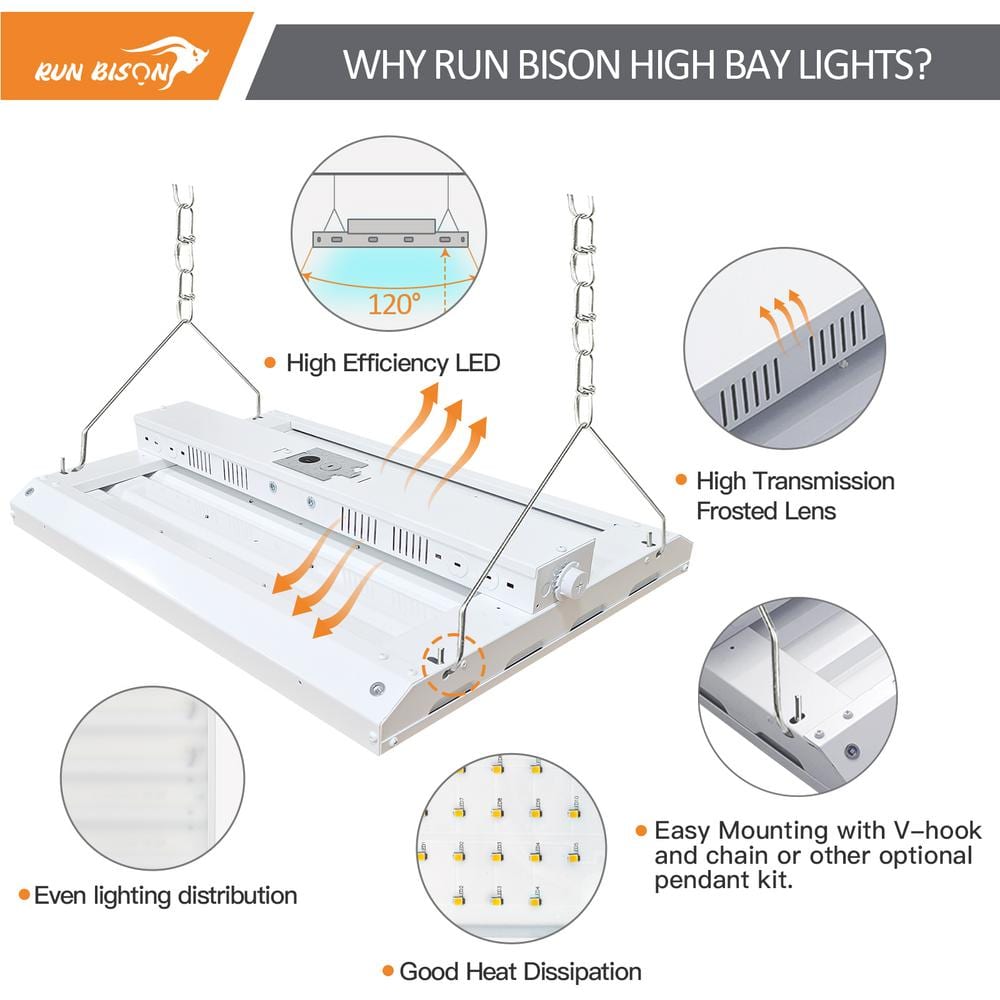 Illuminate large commercial spaces with RUN BISON's 2 ft. Integrated LED High Bay Light. This high-efficiency lighting solution delivers 28,350 lumens per unit, using just 210 watts, offering superior brightness and significant energy savings. Ideal for warehouses, garages, and retail spaces, its daylight hue (5000K) enhances visibility and productivity.